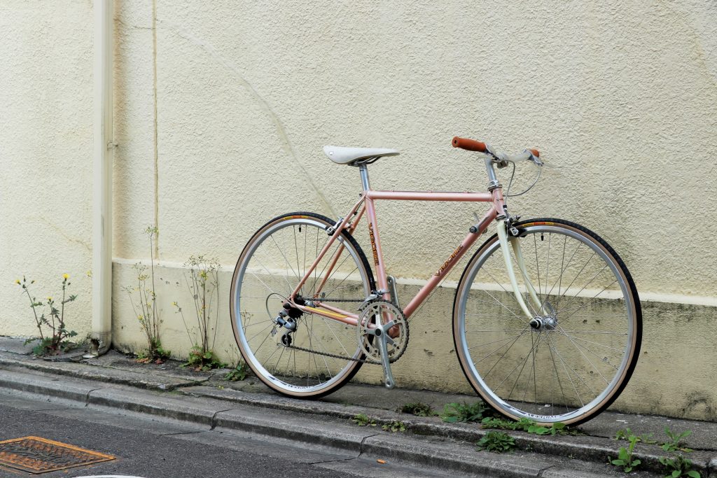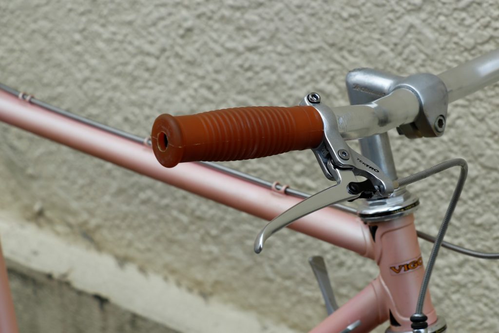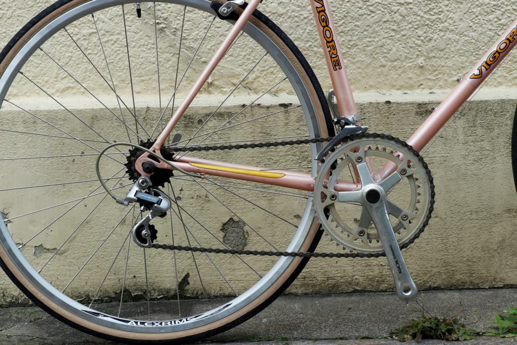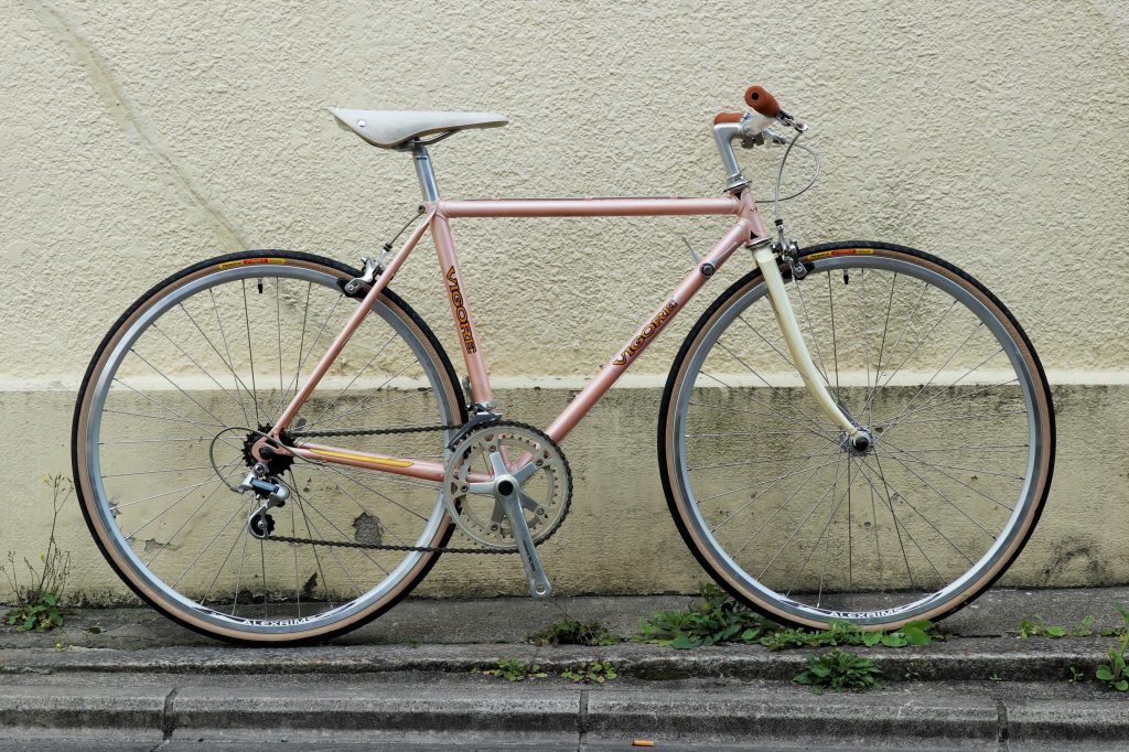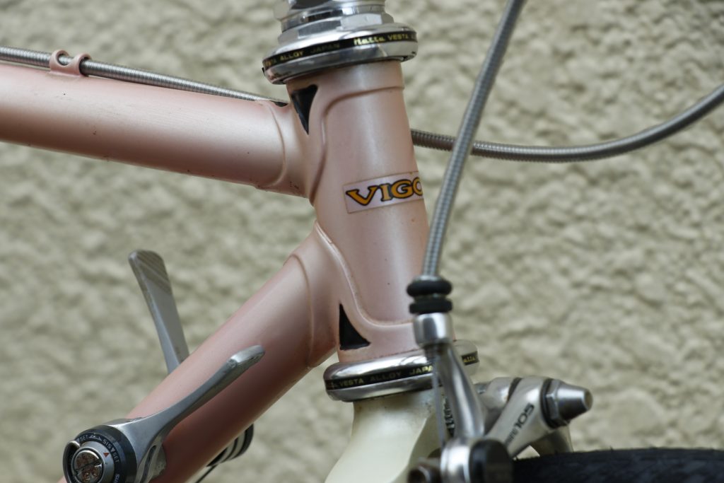 本中古車はおそらくは1980年代にオーダーで製作されたであろう、京都ブランド「VIGORE」さんの650C/26インチホイール クロモリロードをフラットハンドルでカスタムしたものとなります。