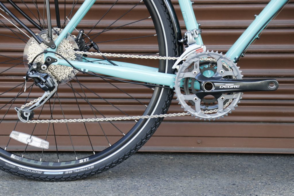 ギア周りはロードコンポよりも強靭なMTBコンポが起用。シマノのミドルクラス「DEORE/ディオーレ」が採用されております。