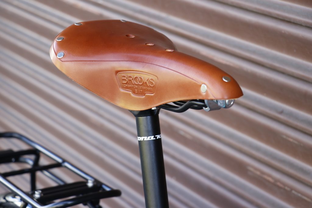 サドルには実に嬉しい、イギリス発ブランド「BROOKS」の本革レザーサドル「B17」が採用。