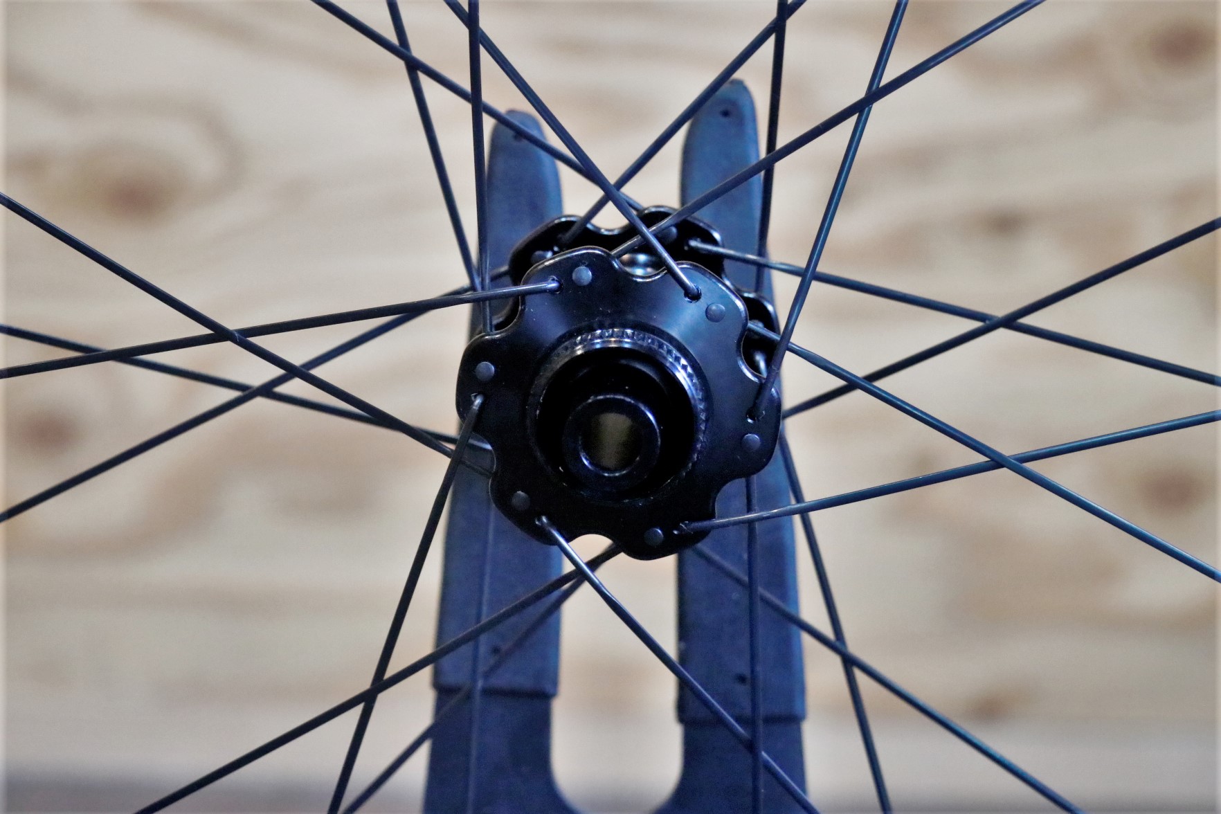 ハイエンドモデルに採用されるカーボンハブは軽量化と最適なスポークパターンとすべく、花型の様な独自のフランジ形状ですが、こちらは通常の円形フランジとする事でコストを削減しています。
