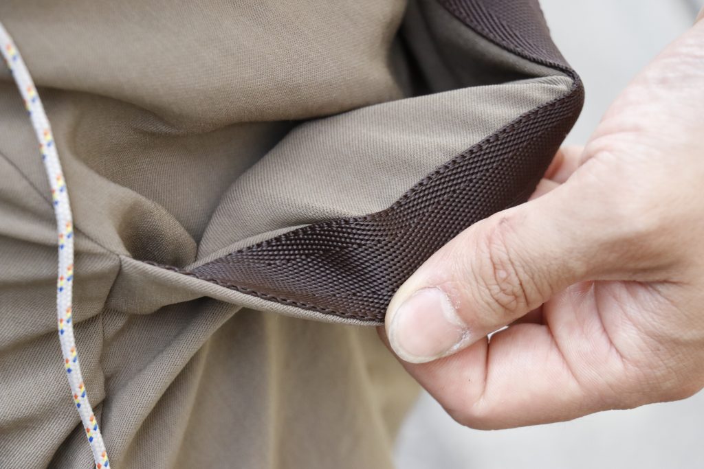 入り口裏側にテープが配されており、ポケット内の荷物の重さや経年劣化により伸びたり=形崩れしないように配慮されているのです。
