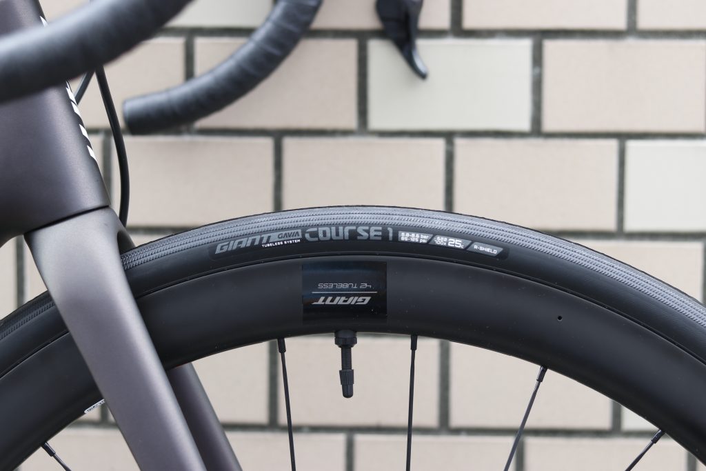 が採用。勿論チューブレスレディ仕様となっており、本モデルにはGIANT GAVIA COURSE 1 700x25C Tubeless Readyタイヤが標準され(シーラントも付属)ておりますので即チューブレス仕様でお乗りいただけます。