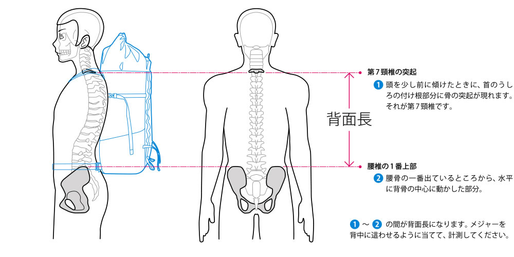 ウエストハーネスが簡易式のAntelopeは背中の長さとバックパックの背面長との適正範囲をある程度多めに設けてありますが、まずはイラストを参考にご自身の背中長の長さを図っていただき、バックパックの背面長に近い方のサイズをお選びください。