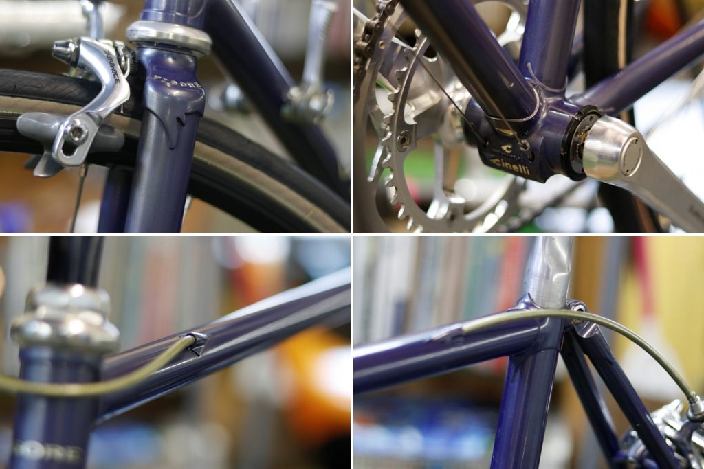 凝ったデザインのフォーク肩ラグ、チネリ製ハンガー、リアアウターケーブル内臓。