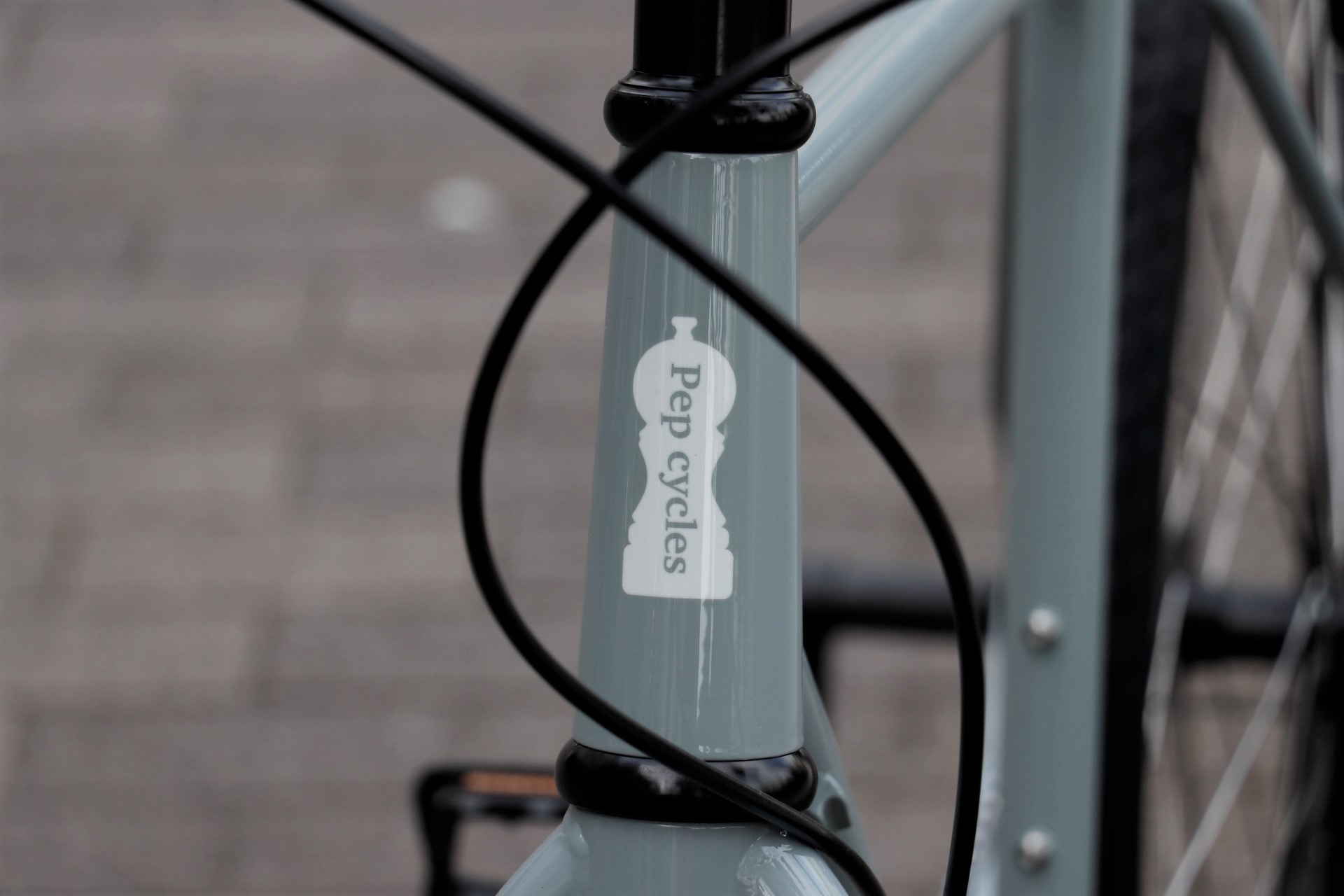 「PEP CYCLES」のデザインは、あえて各社セオリーとなるダウンチューブのロゴは廃し、なんとも愛らしいコショウ入れ=ペッパーミルデザインのヘッドマークがメイン。