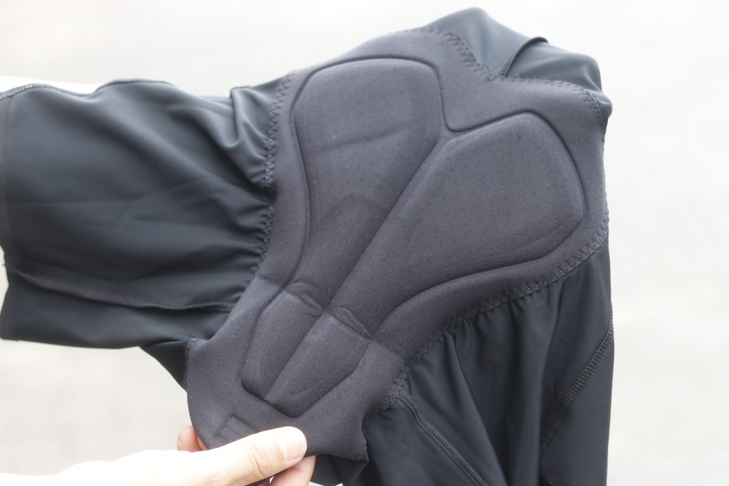太腿のグリップテープは外側の180°のみに配置してあり、快適性を維持しながらもズレ上げることはありません。