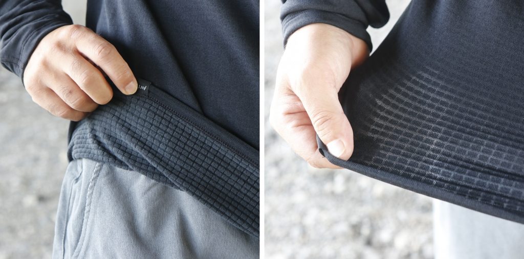 使用されるPolartec®PowerGrid生地は軽くてあったかいのに風抜けが良く汗をかいても素早く吸水速乾。愛用するスタッフも肌寒い季節が来たらほぼこればっかりと断言。