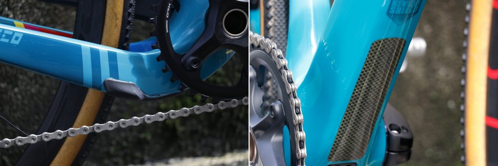 ダウンチューブ裏~チェーンステーの一部裏には、路面から跳ね上げてくる小石のヒットからフレームを保護するべくケブラー層を配置。