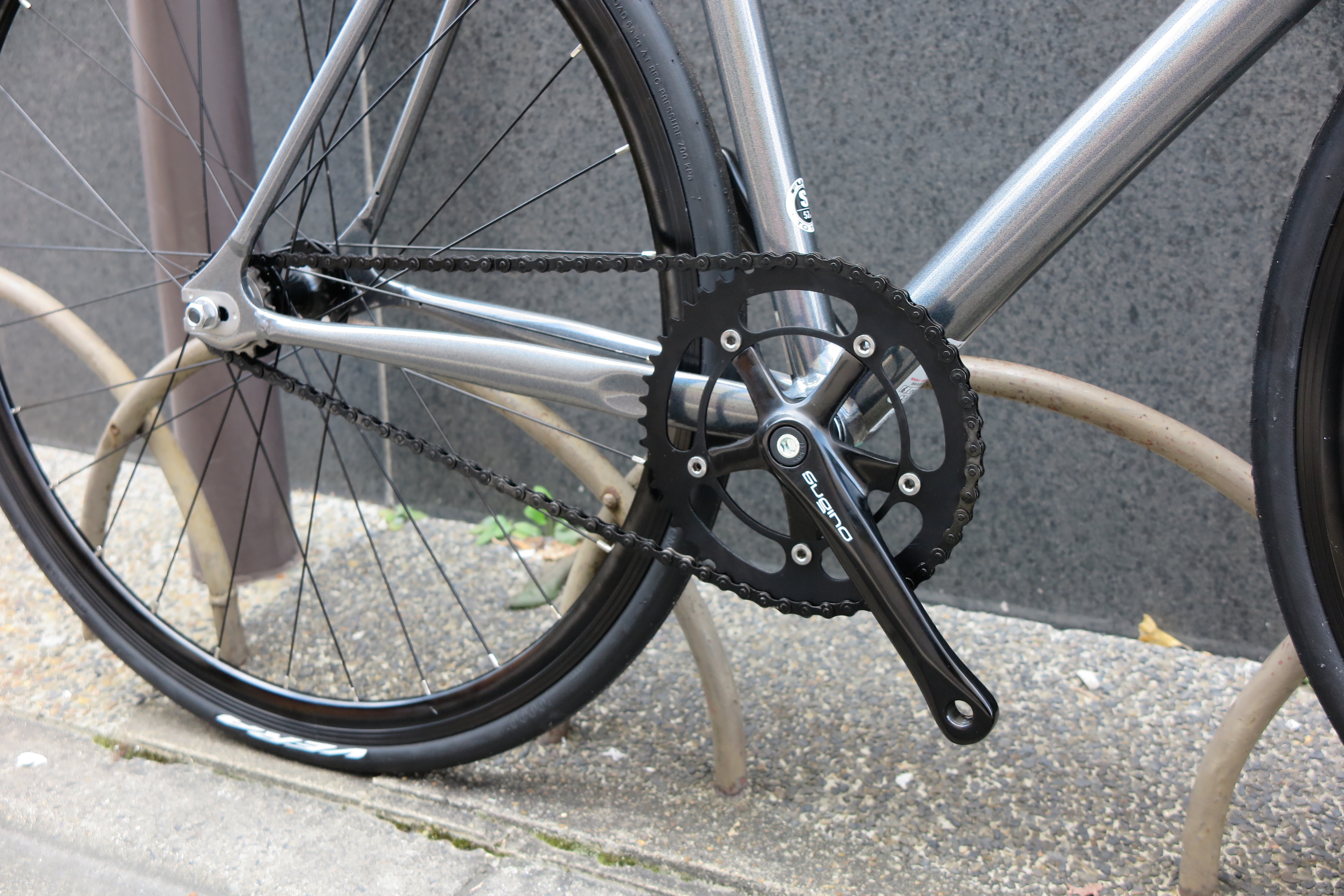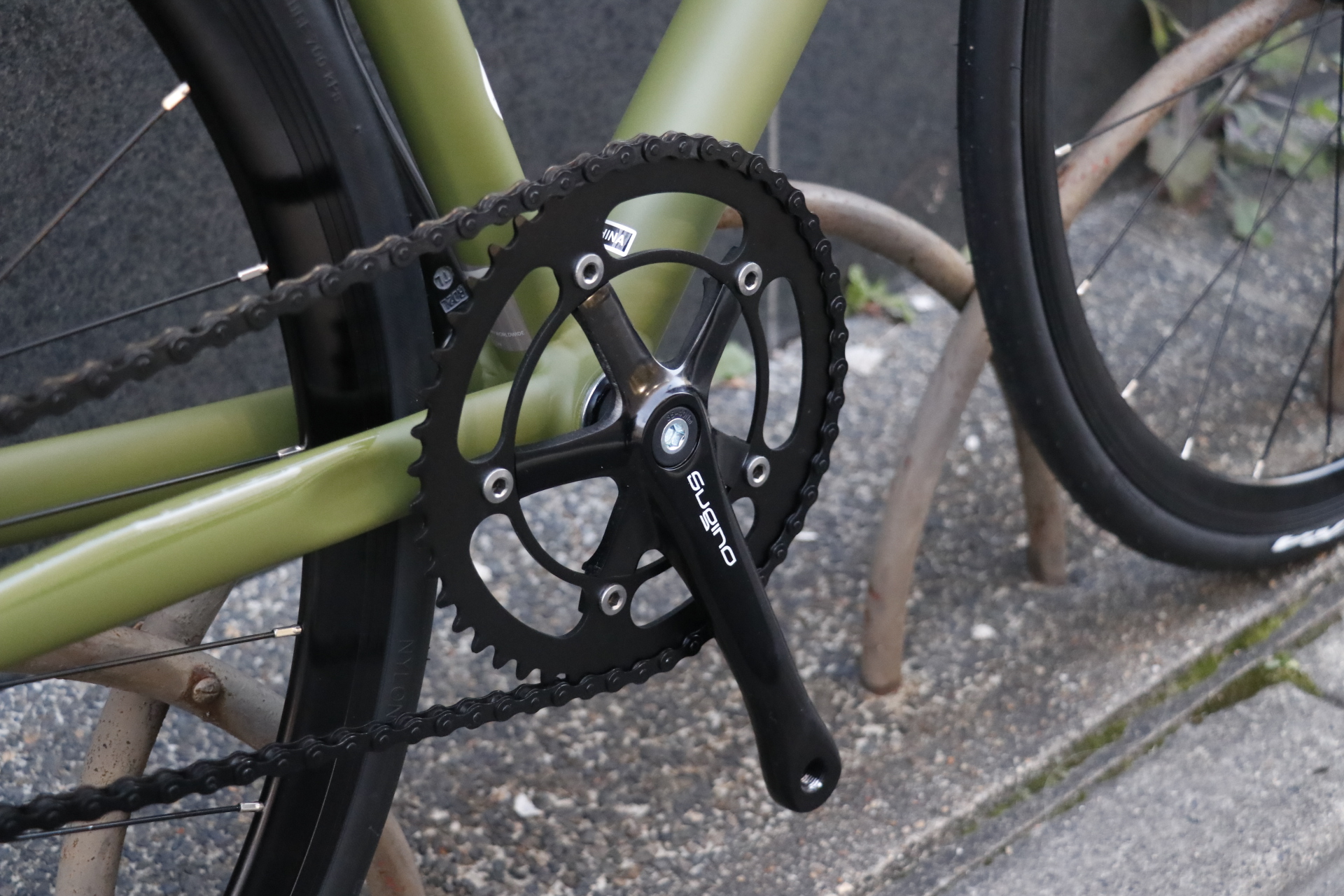 シングルスピードバイクの顔とも言えるクランクは日本が誇るクランクメーカー SUGINO を採用。