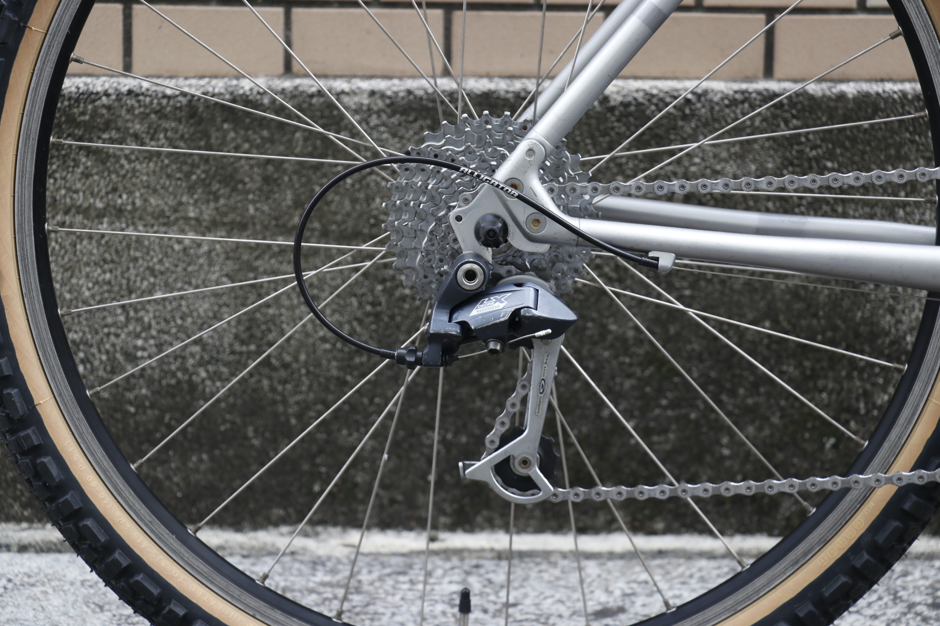コンポーネントはフレームの年式よりも 1~2世代後となるDEORE、LXなどをミックスした3×9スピード仕様。