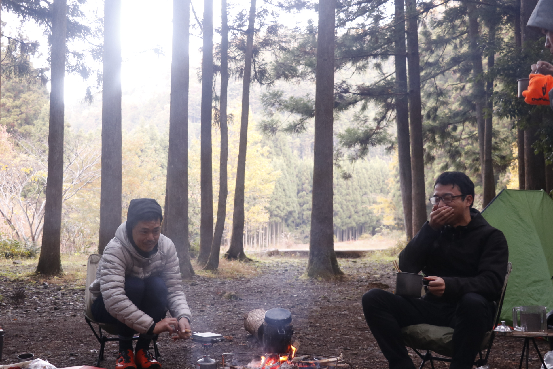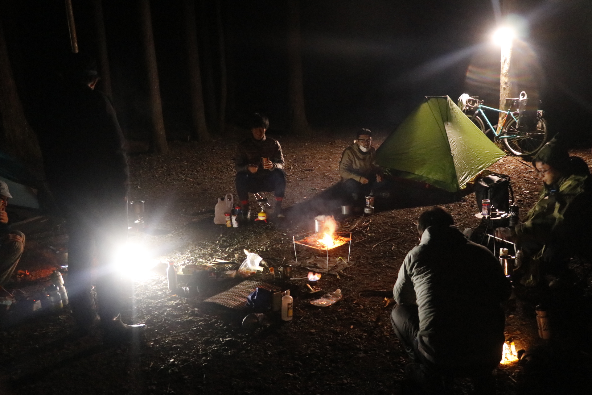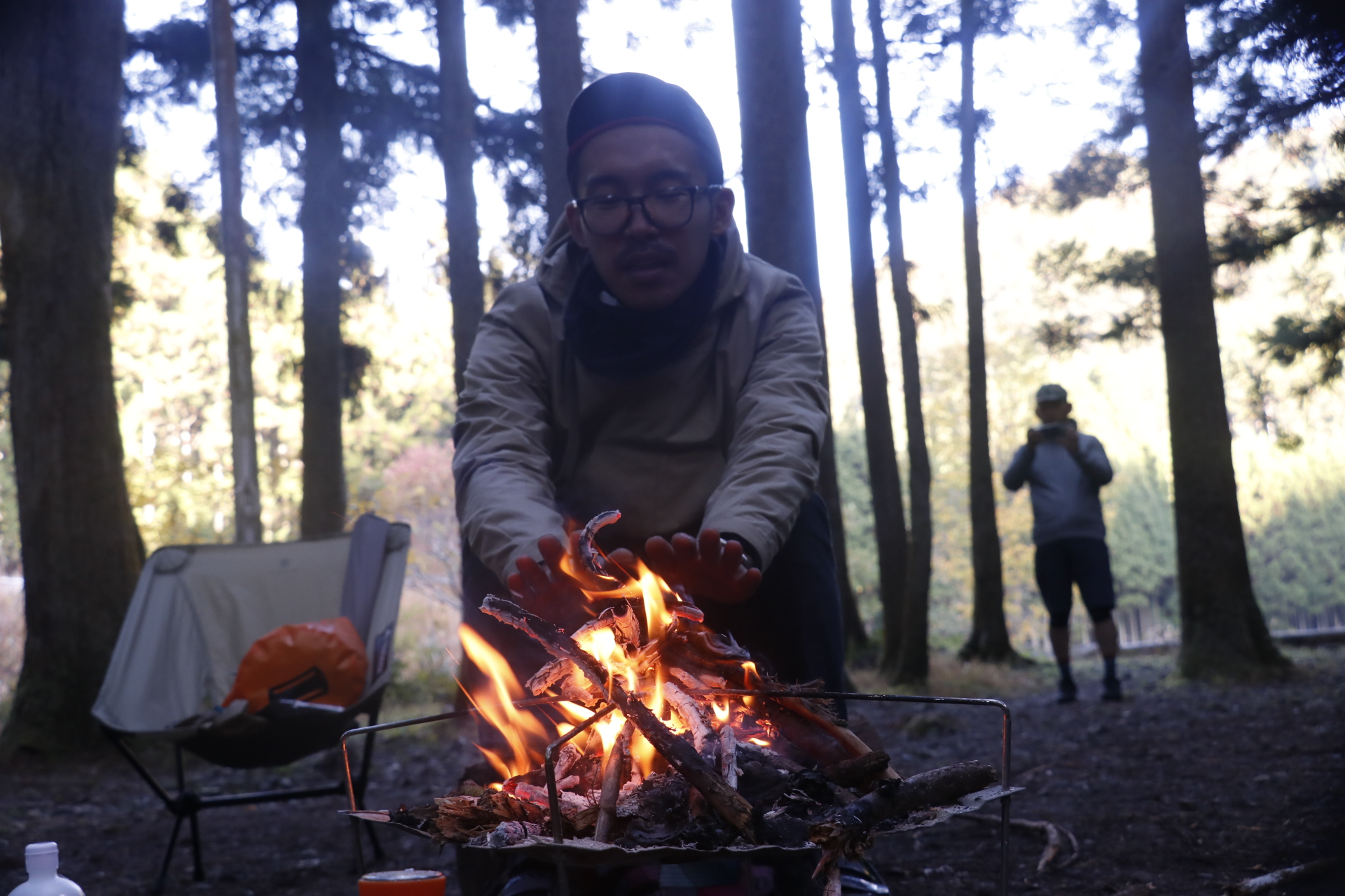 あっという間にキャンプ場に到着!流石に山の中は寒いのですぐさま焚火&クッキング!(勿論、NOT直火。エチケットですね◎)