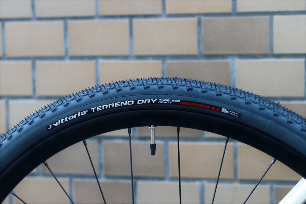 標準装備されるVITTORIA TERRENO DRYは低いノブが特徴のドライコンディションで高速域が得意なグラベルタイヤ。