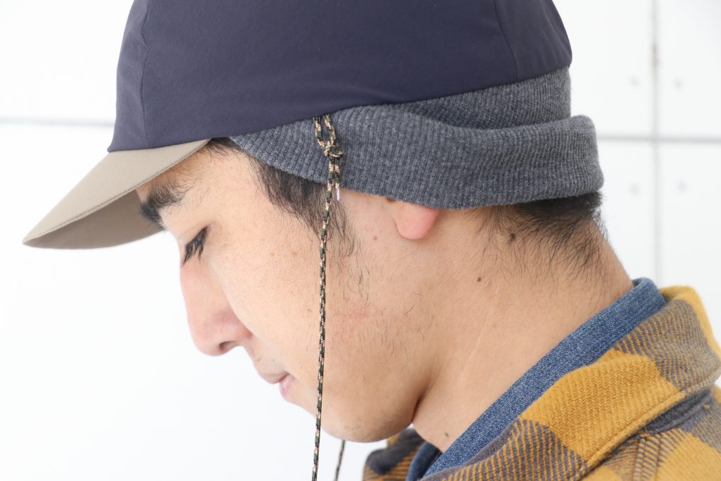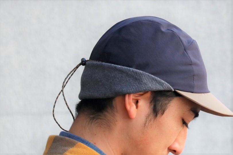 ハイク時など強風の時にも役立つハットコード。邪魔な時はこんな感じで後頭部側へ。余ったコードは耳当ての中に放り込んでおいても良いですね~!