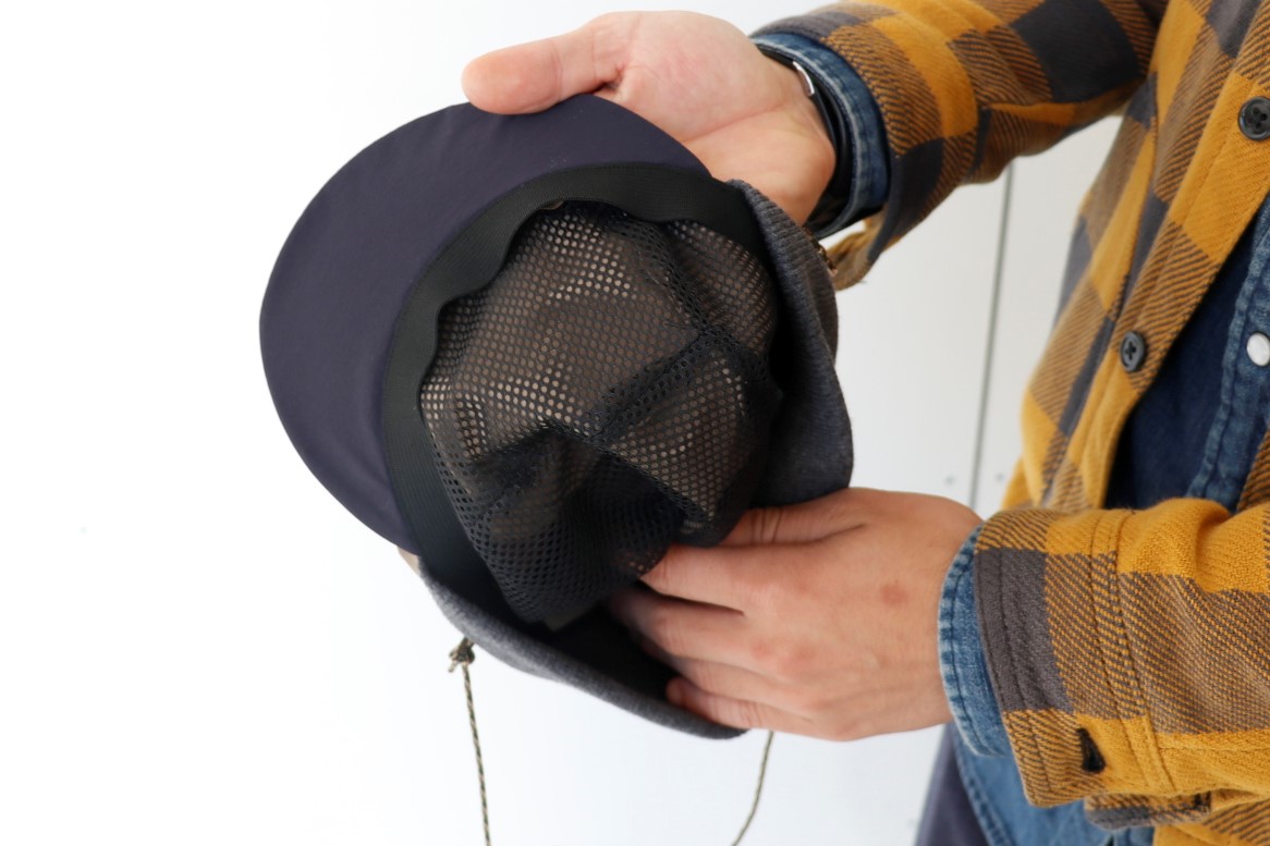 メイン素材は日本の季候にピッタリな、接触冷感&撥水加工のさらっとした触感のドライストレッチ。裏地はドライメッシュで頭部の熱や湿気を放出。