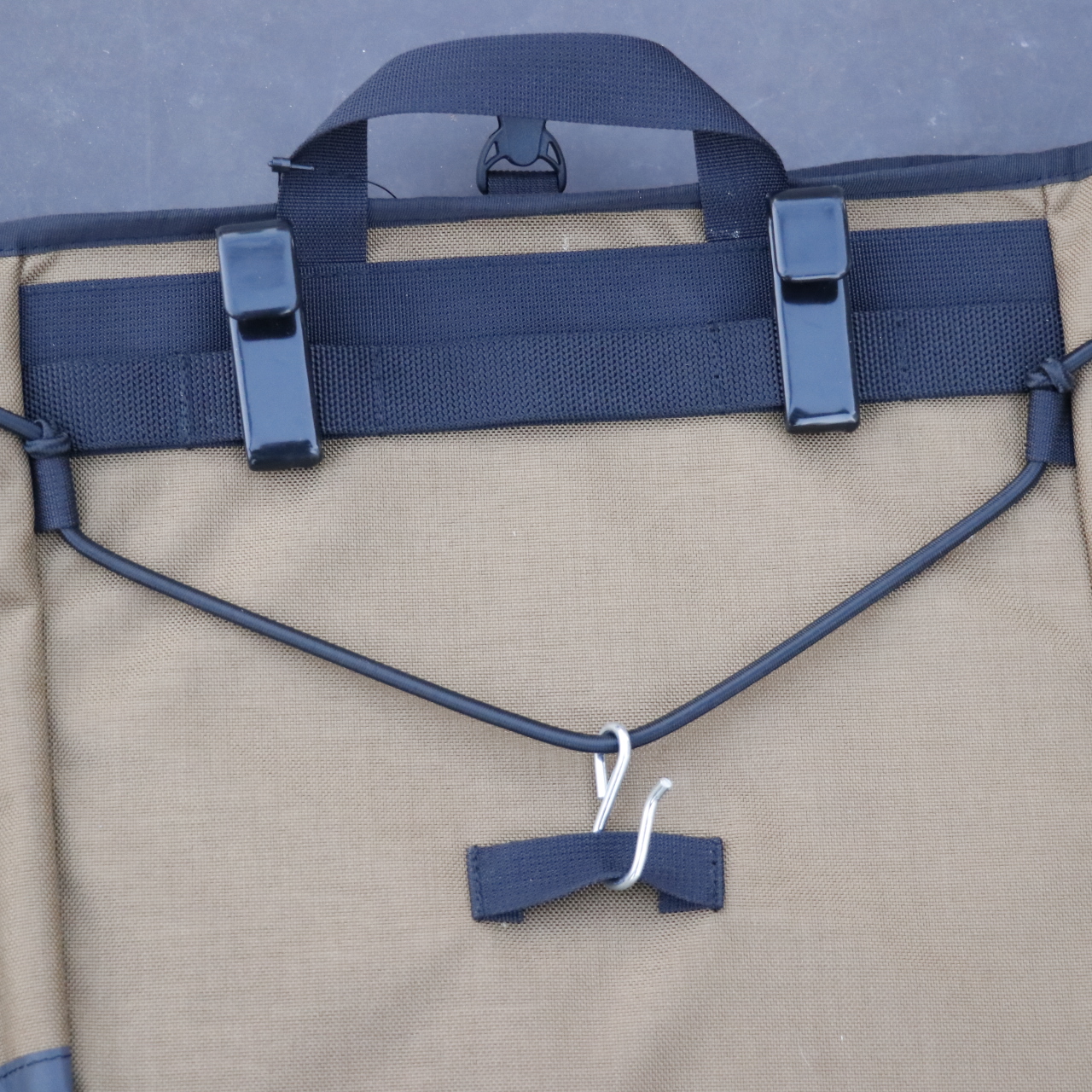 取付は上部2つのフックと下部1つのバンジーコード付きフックで固定するとてもオーソドックスな仕様。