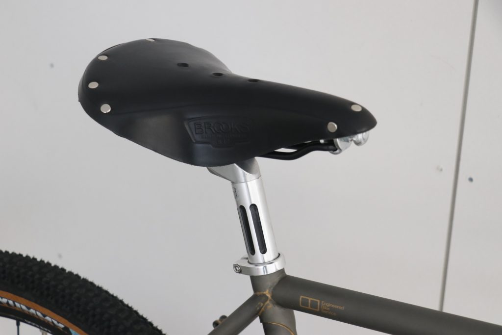 サドルには、座れは座るほどお尻に馴染む本革レザーサドルにおける永遠のスタンダード「BROOKS B17 STD」をチョイスし、シートポストには、ビンテージバイクの雰囲気漂う 墨入れデザイン& 2,800円(税抜)という販売価格が単純に嬉しいBL SELECT* slit seatpostをチョイスしました。