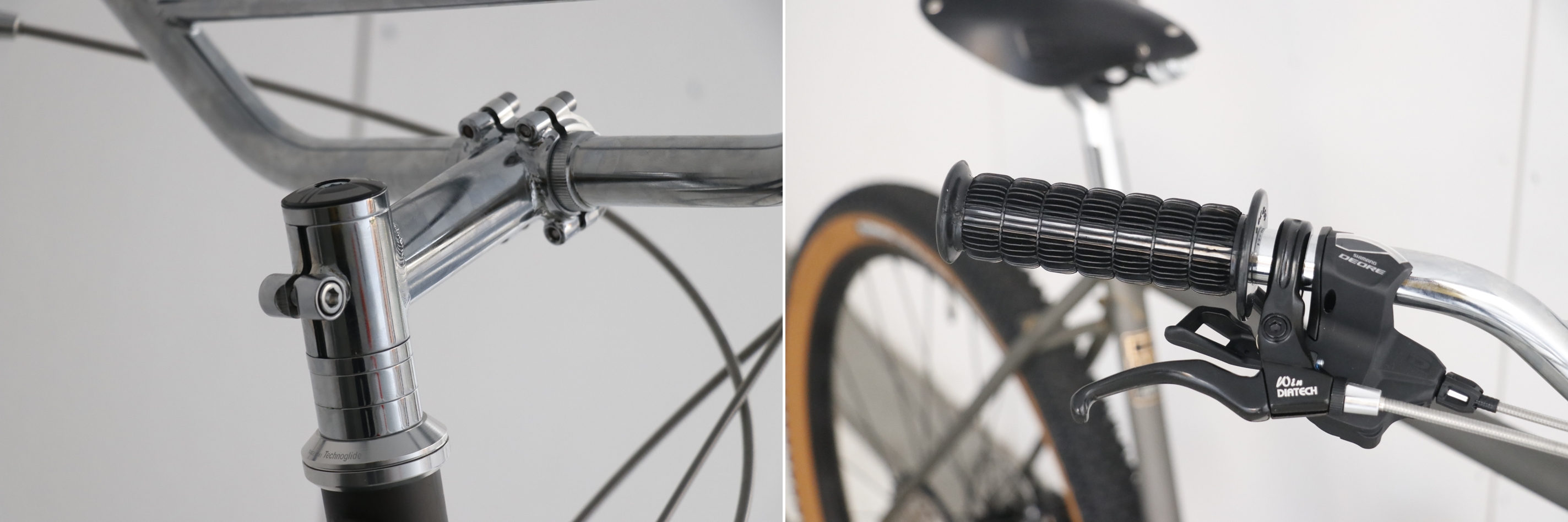 ハンドルには、HEYJOEの為に作られたといっても過言ではない「E.B.S」x「NITTO」謹製 「RAMO BAR / EBS-40ハンドルバー」に同じくNITTO製 SIMWORKSオリジナルTomboy Stem & NITTOスペーサーでこの上なく美しいアッセンブルを。