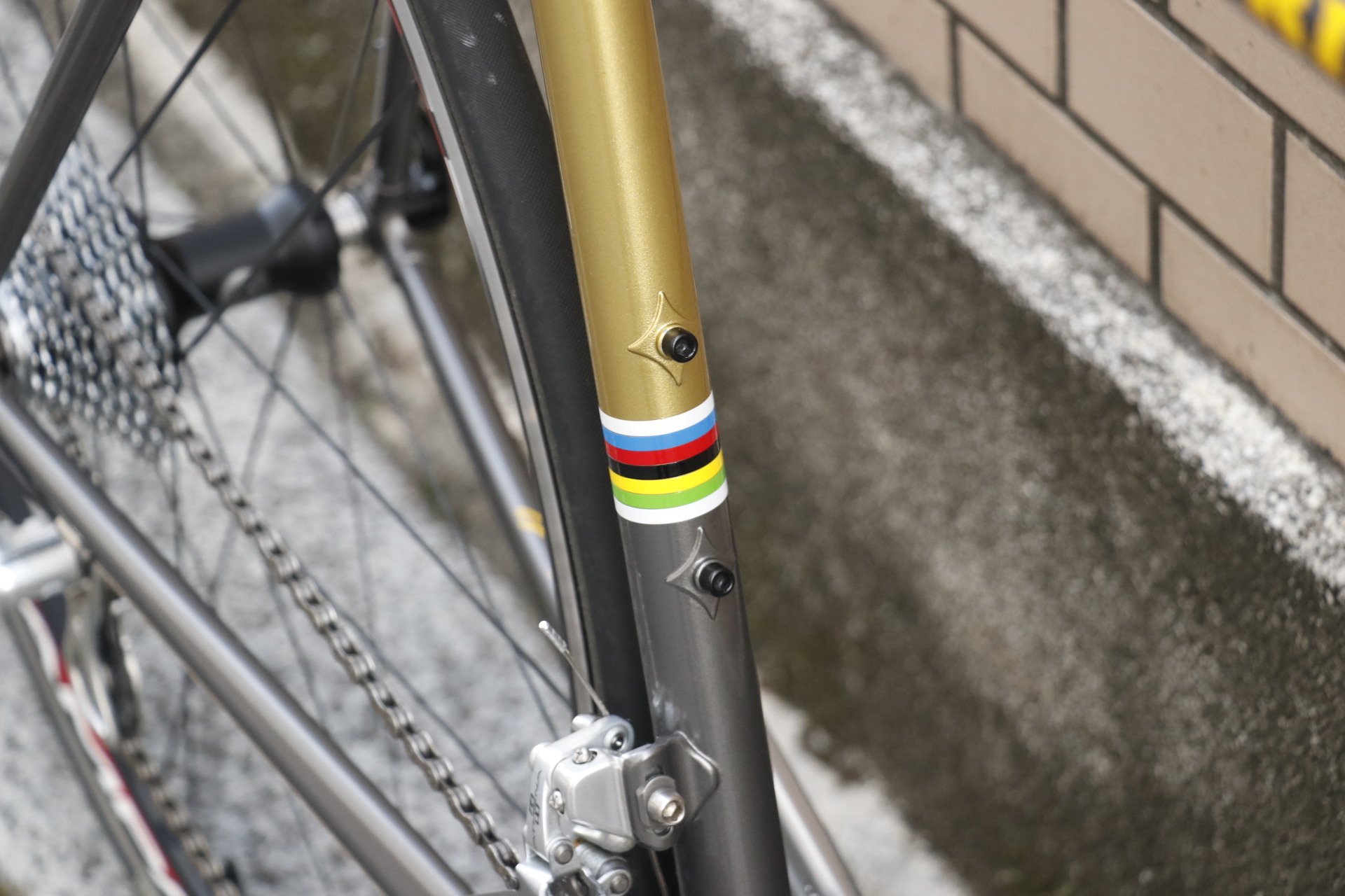 シートチューブには世界チャンピオン経験のあるブランドにのみ使用が許されるアルカンシェルがあしらわれています。