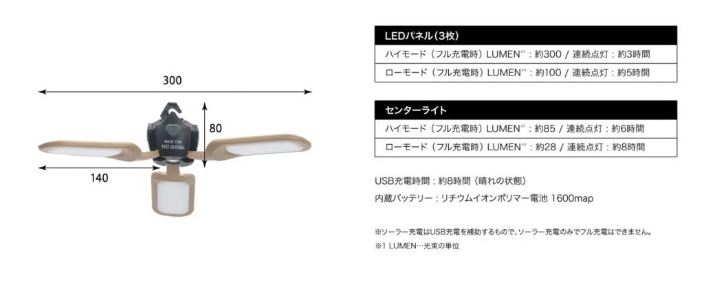 3枚のメーンLEDパネルは約300ルーメンの照度で約3時間連続点灯可能。
