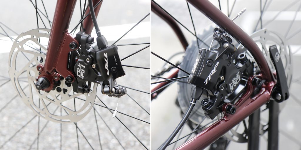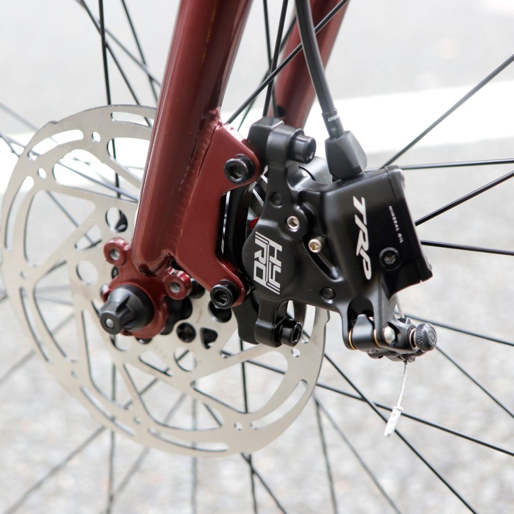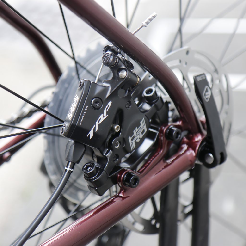 なんとこの完成車価格で、メカニカルに比べてクリアなタッチとより高い制動力を用意する TRP製 高性能 油圧キャリパー HY/RD(機械式レバーで動作)が使用されています。