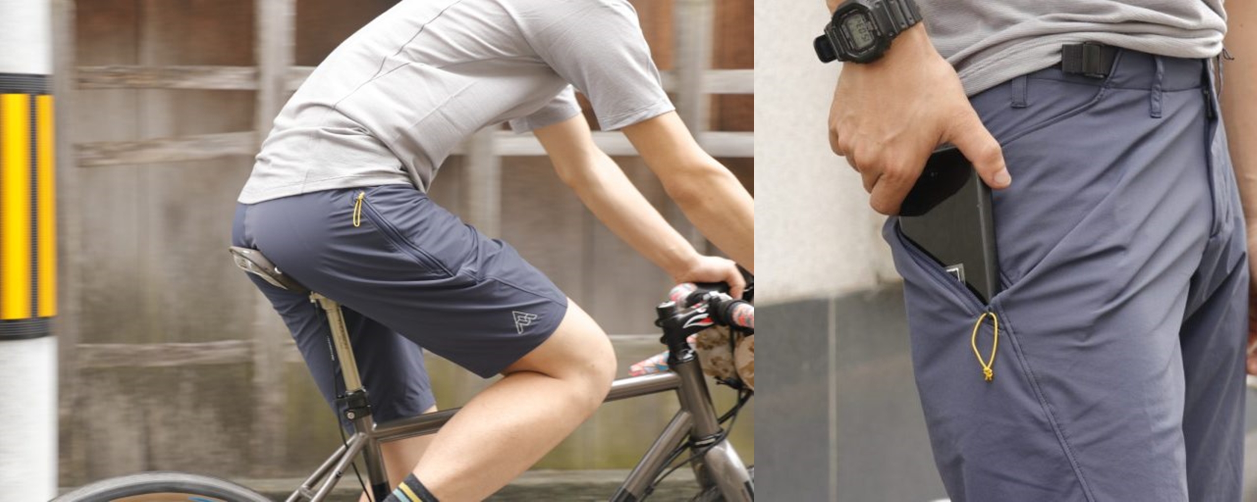 ハンドポケットの他に太ももに配置されたジッパー式ポケットは、スマートフォンや補給食、地図を収納するために配置され、その独特のパターンと角度からペダリングを全く妨げること無く収納することが可能です。