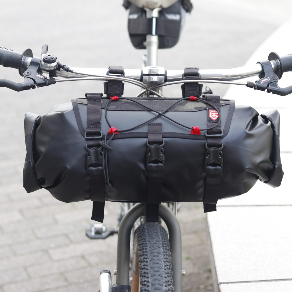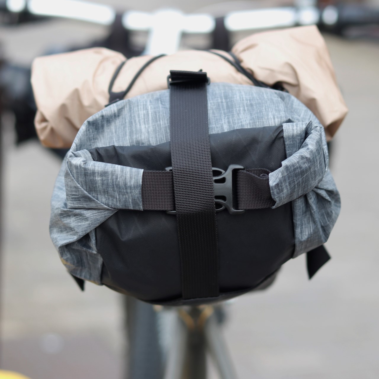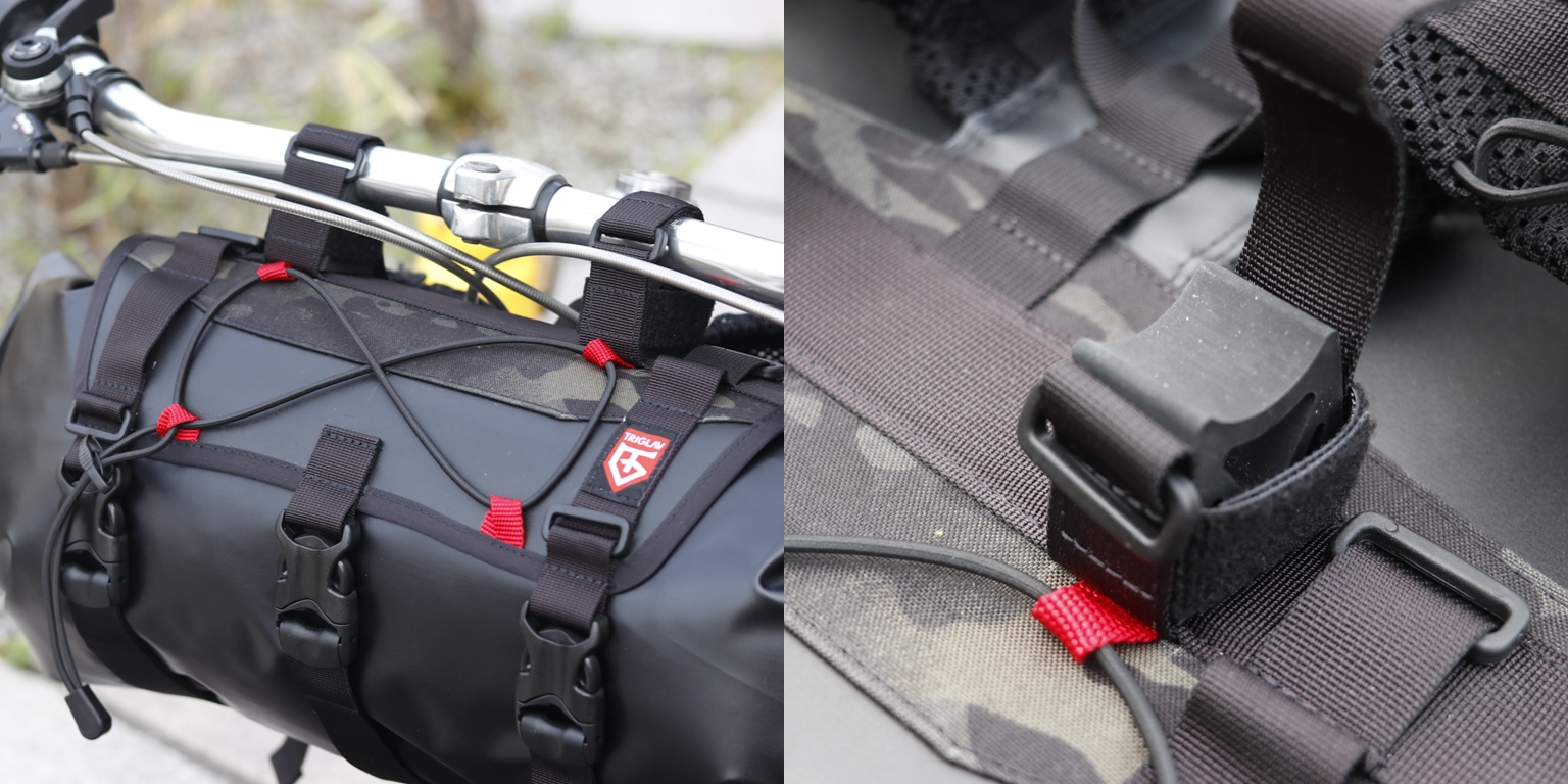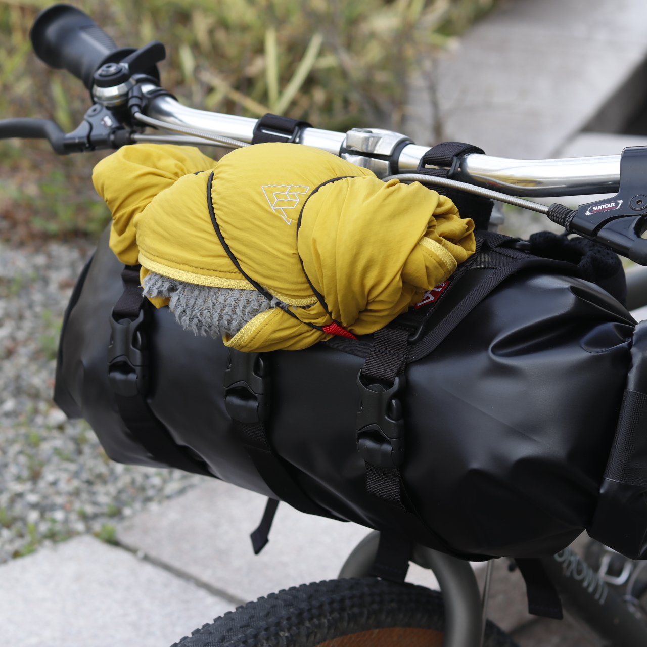 3つのコンプレッションストラップが配備された メインハーネスにテントやシュラフ、ドライバッグに収納した荷物などをロールして、ハンドルバーに取り付けるアイテムとなります。※ドライバッグは別売りです。