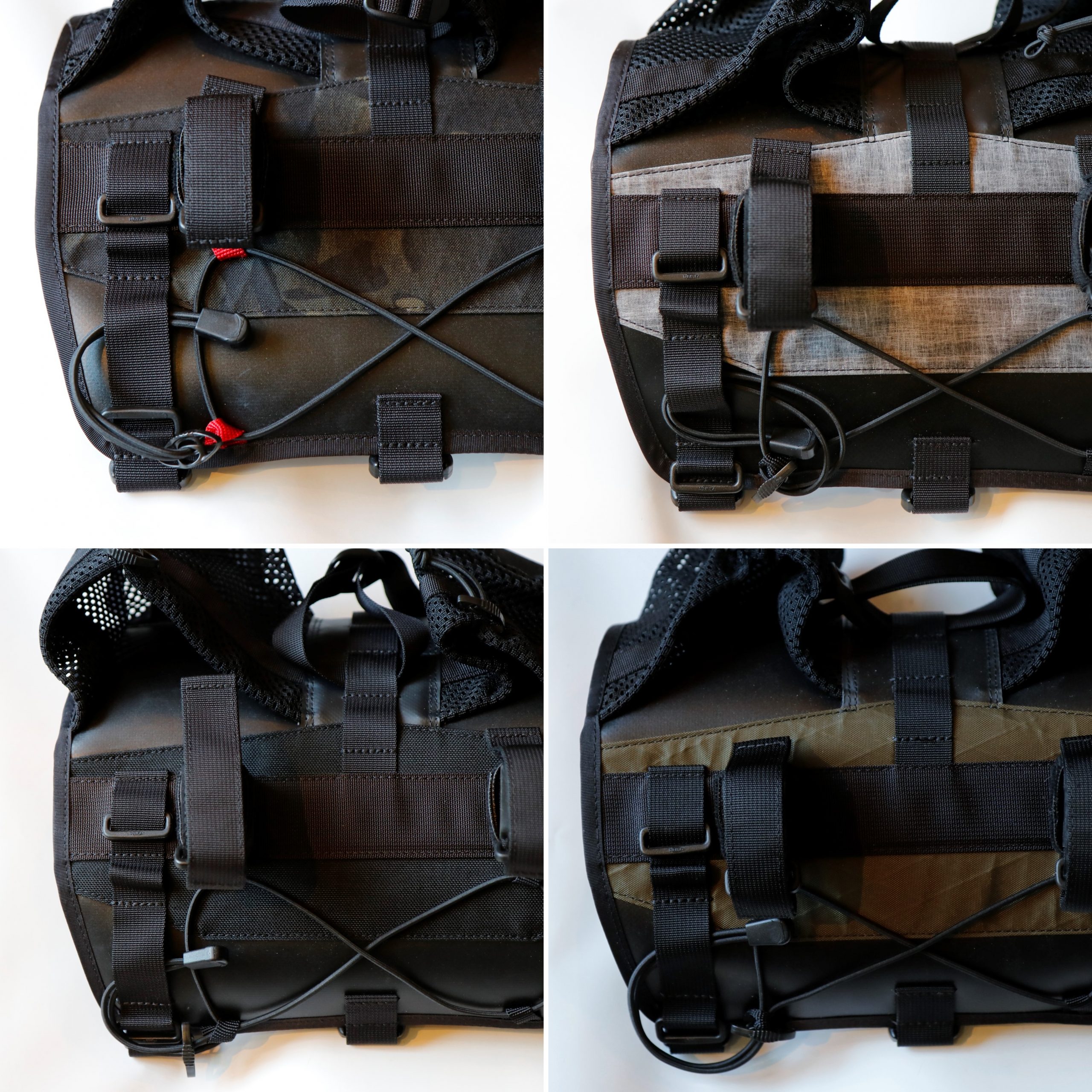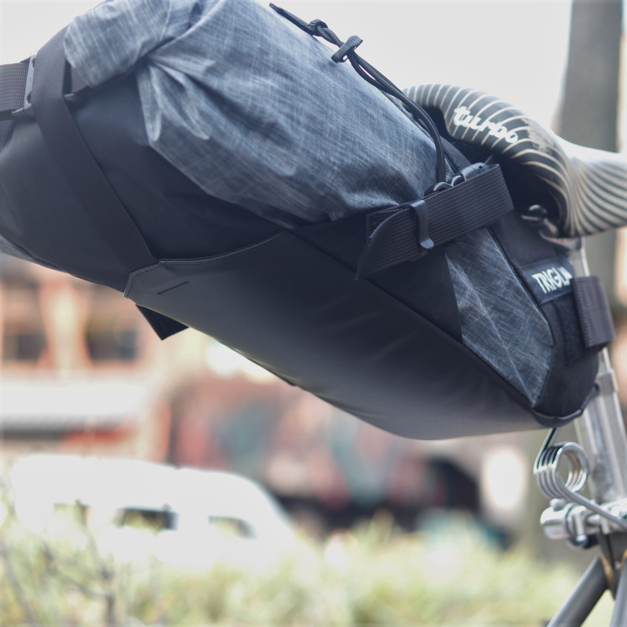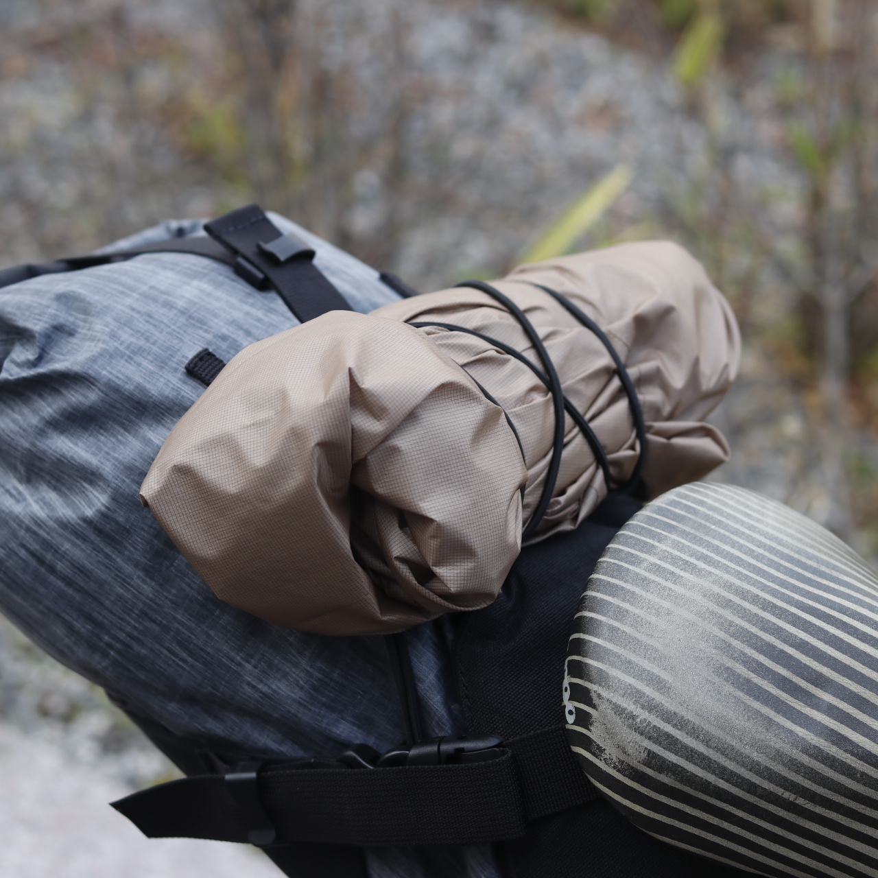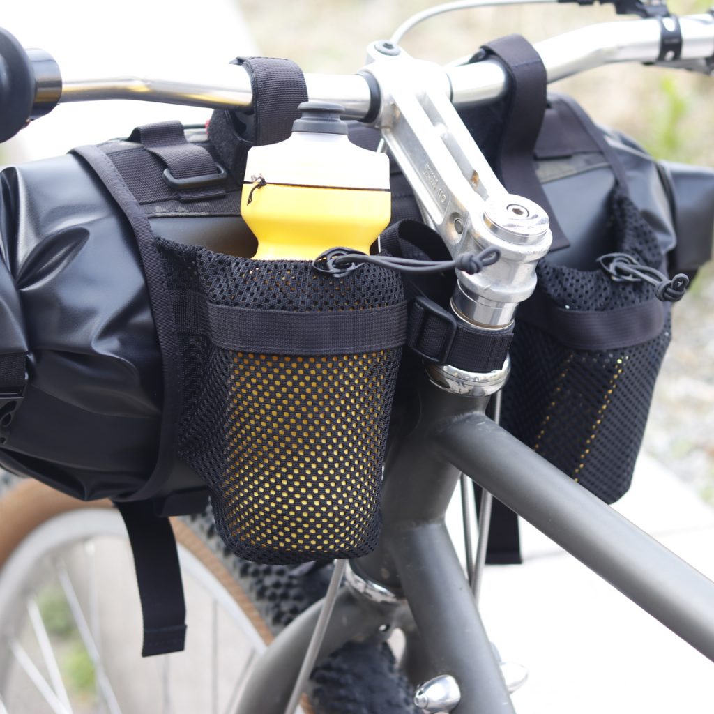3つのコンプレッションストラップが配備された メインハーネスにテントやシュラフ、ドライバッグに収納した荷物などをロールして、ハンドルバーに取り付けるアイテムとなります。※ドライバッグは別売りです。