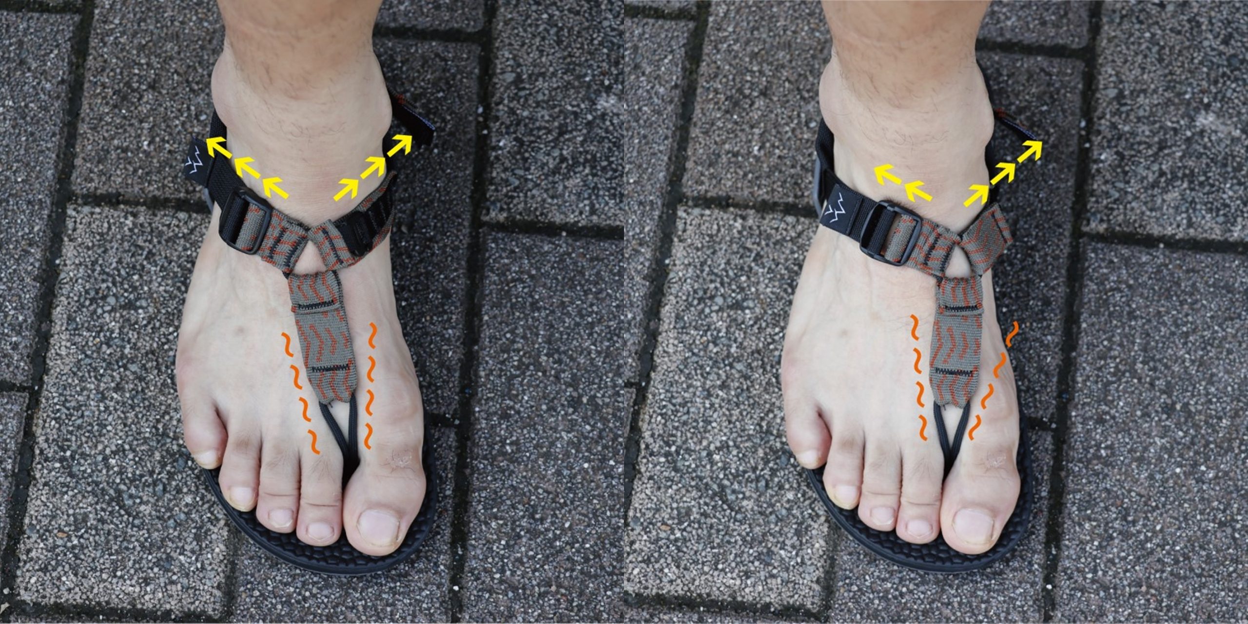 足甲部分ににはOリング中心に構成された3つのストラップで構成され、内側のGフックと外側のバックルの調整により、鼻緒部分の角度、Oリングが甲に当たる位置なども細かく設定できるため、しっかりとホールドされた状態でも足/指への締め付けのストレスを最小限に抑えることが可能です。