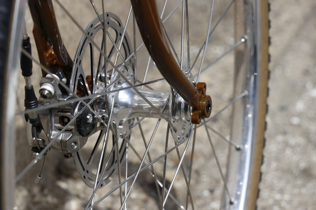 ホイール周りには、当店では実にご要望の多い、ポリッシュカラーが嬉しい、VELO ORANGE製 Disk Hub x Voyager Rimを手組みでご用意。