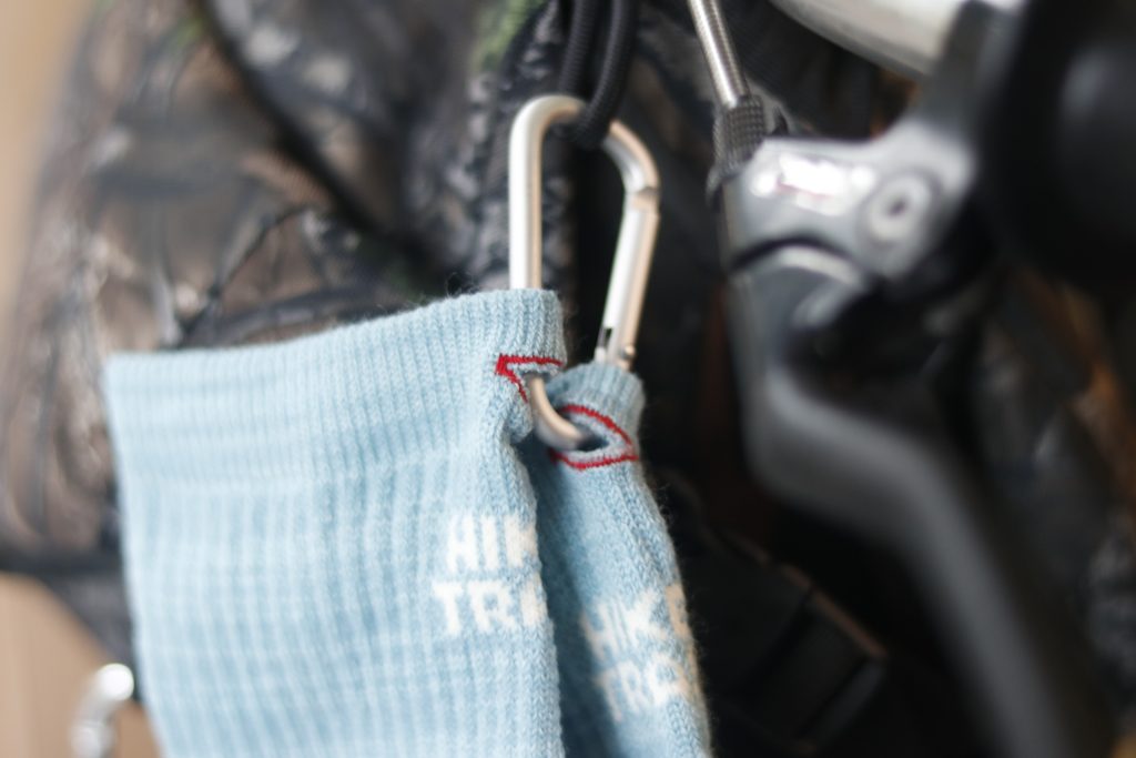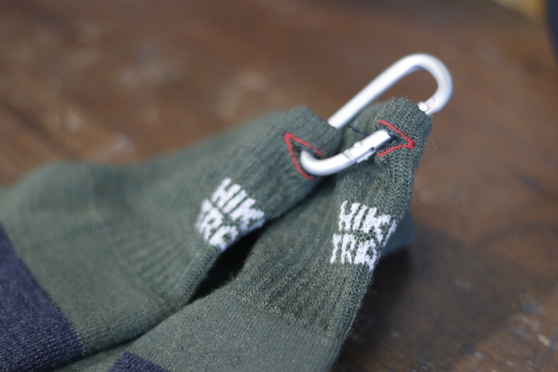 全てのすべてのアイテムにはソックスを乾かすためのカラビナホールと、オリジナルカラビナが付属します。