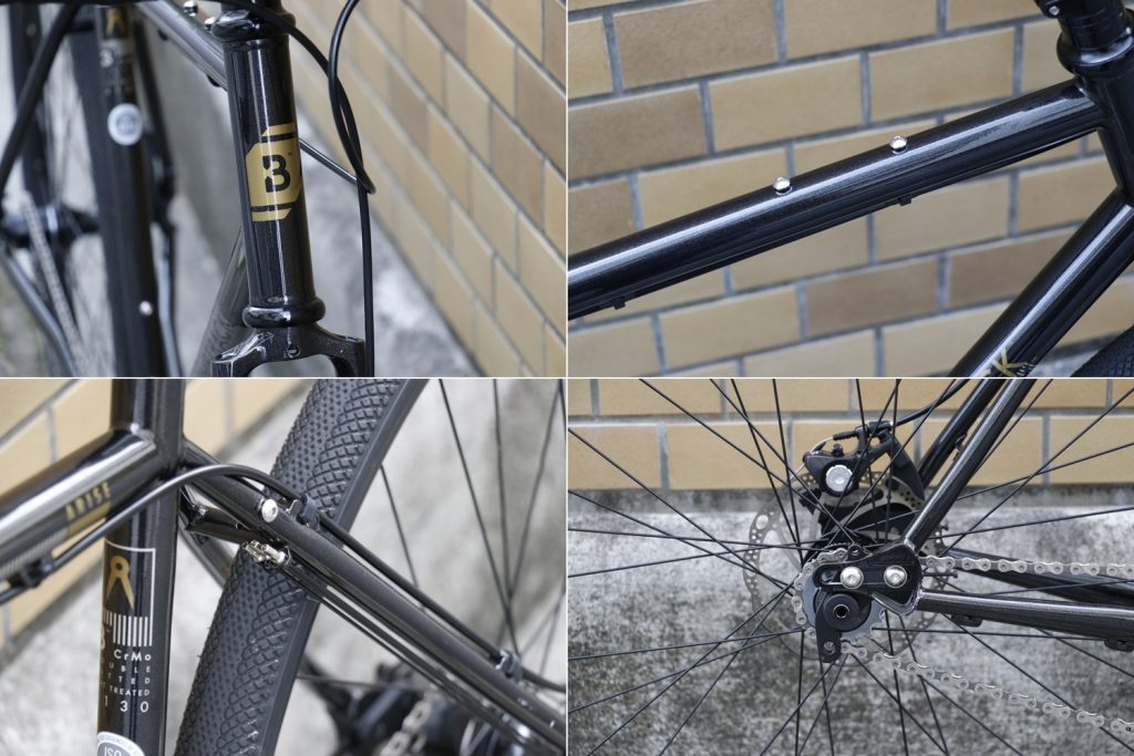 | フレーム | 4130 ダブルバテッドクロモリ、TAスライド式ドロップアウト、ラック/フェンダーマウント、68mm BSA BBシェル |