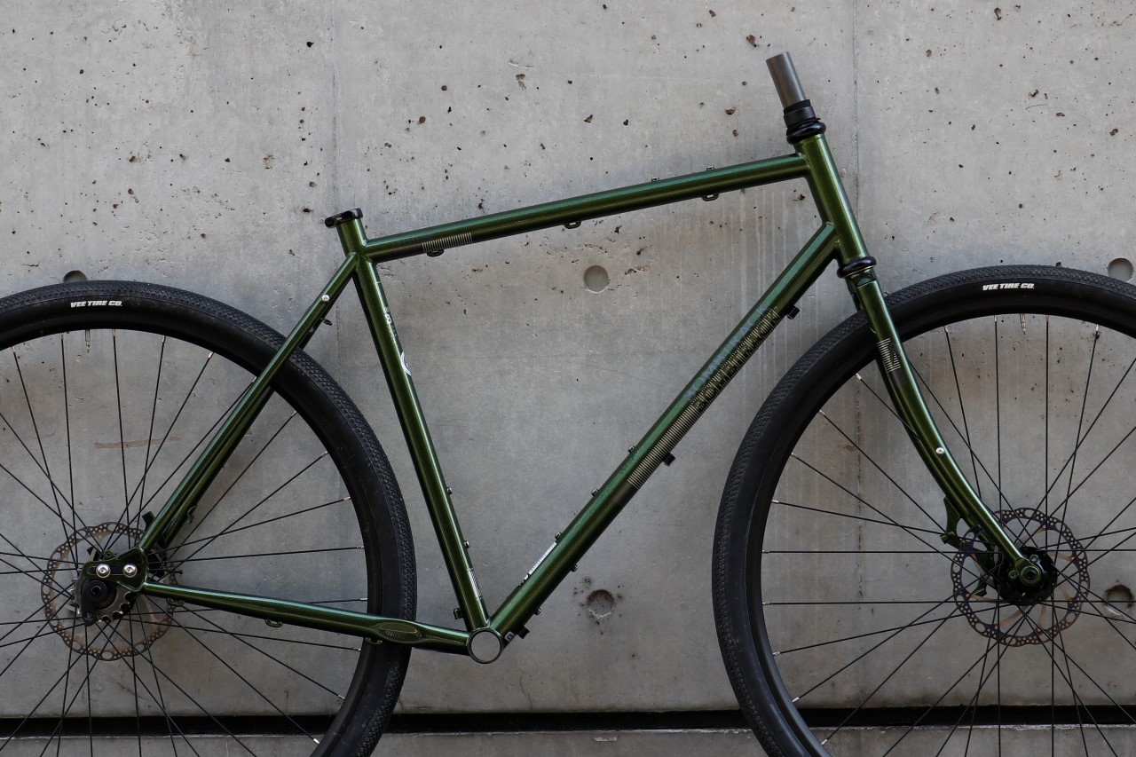 タフなクロモリパイプをトラディショナルなツーリングバイクらしい曲線美の感じられるルックスで作りながらも、『スルーアクスル&フラットマウントディスク』を採用、更に『シングルスピードorギアード両OKなスライダーエンド』も盛り込んだユーティリティープレーヤーな一台です!