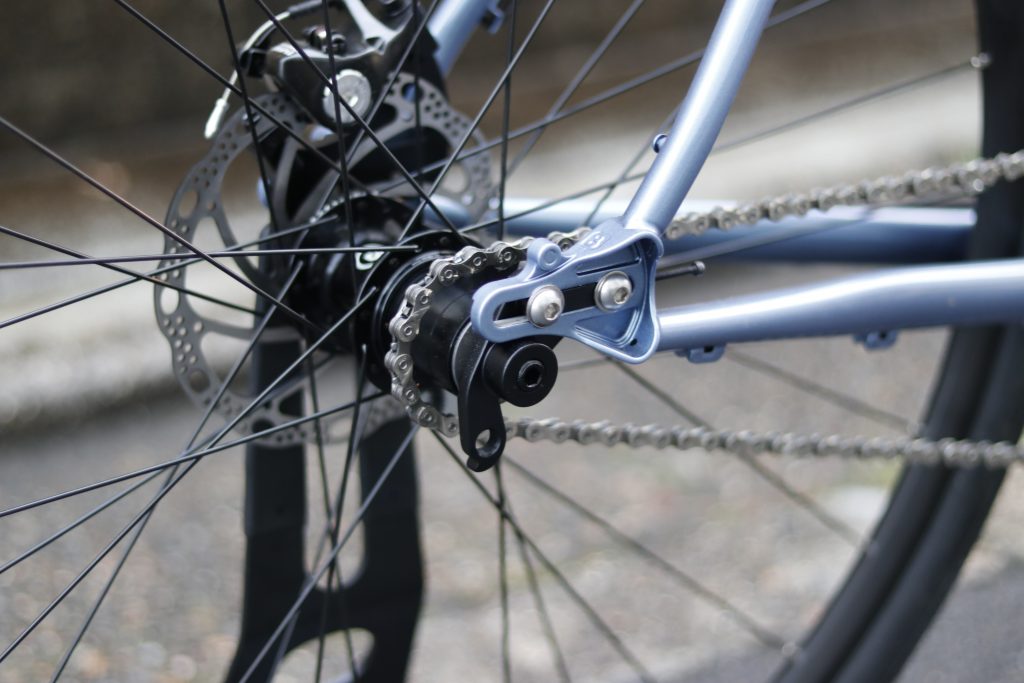 そして、本モデルのポイントともいえるスライダーエンドは、単純にシングルスピードでの使用を可能にするだけでなく、チェーンステー長の変更により自転車全体の特性を加速重視の軽快なバイク↔ゆったり走る安定感重視のバイクに自由に切替できる事にもあります。