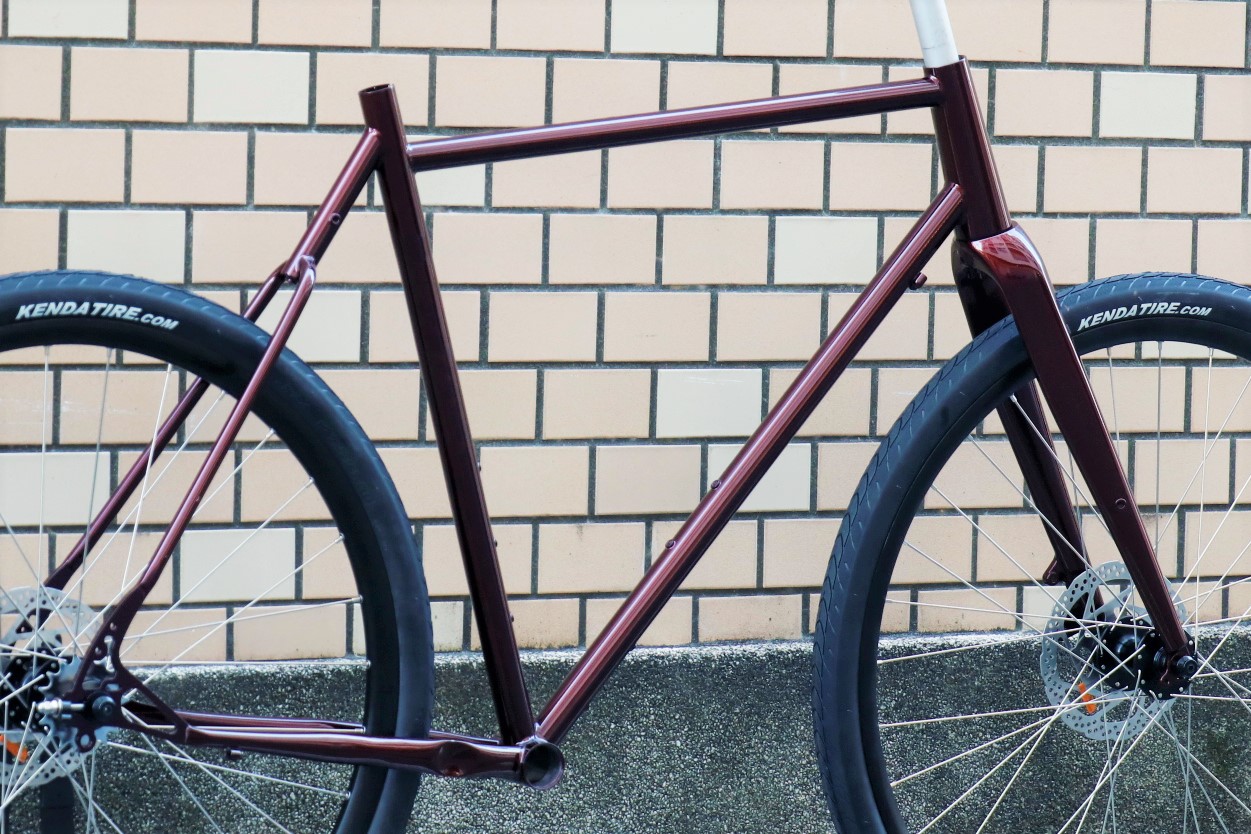 本フレームセットは、完成車モデルと同じテーパーヘッド規格を採用したクロモリフレームに、カーボンフォーク(完成車ではクロモリフォークが採用されます)をアッセンブルしたものとなります。