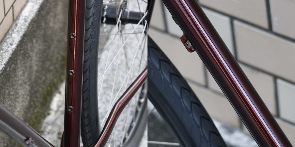 最大タイヤ幅:700Cx45c/650Bx50cのクリアランスに、キャリア&フェンダー位置含め、シートチューブ上x3穴、ダウンチューブ裏、フォークエンド/サイドなど多くのダボ穴が用意。