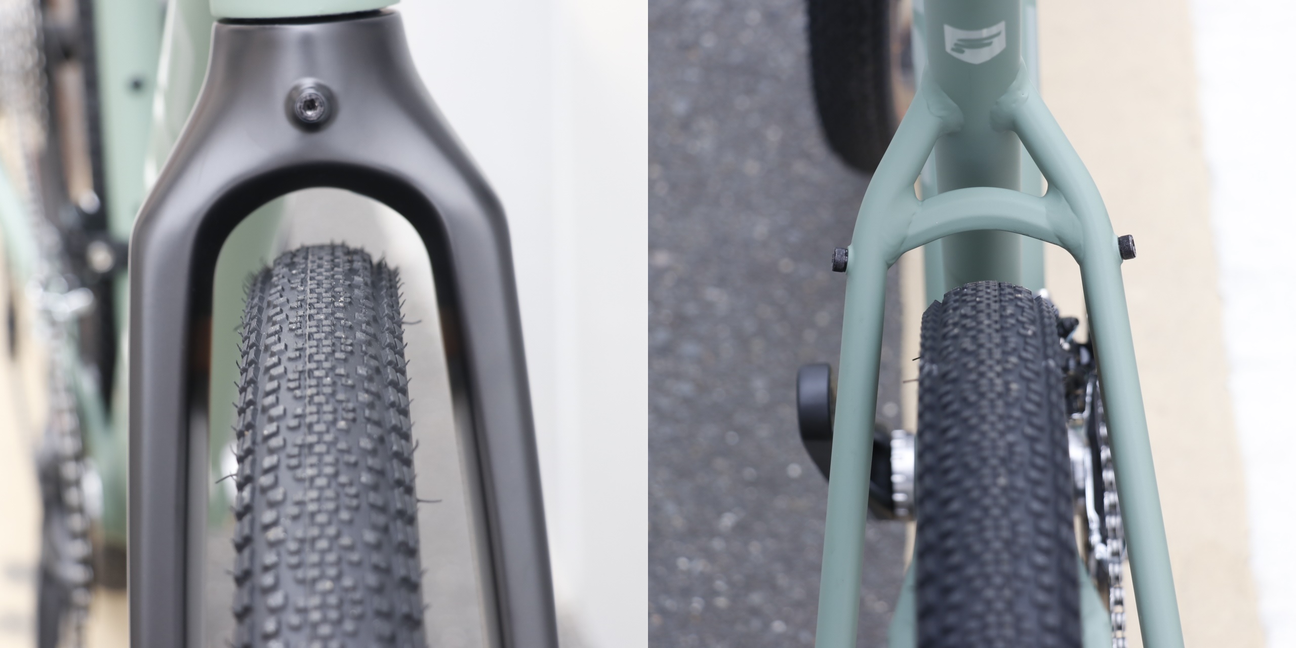 グラベルバイクで気になるのがタイヤクリアランスですが、700×45cのセミブロックタイヤでも余裕がありますのでまだまだ太いタイヤが履けそうです◎