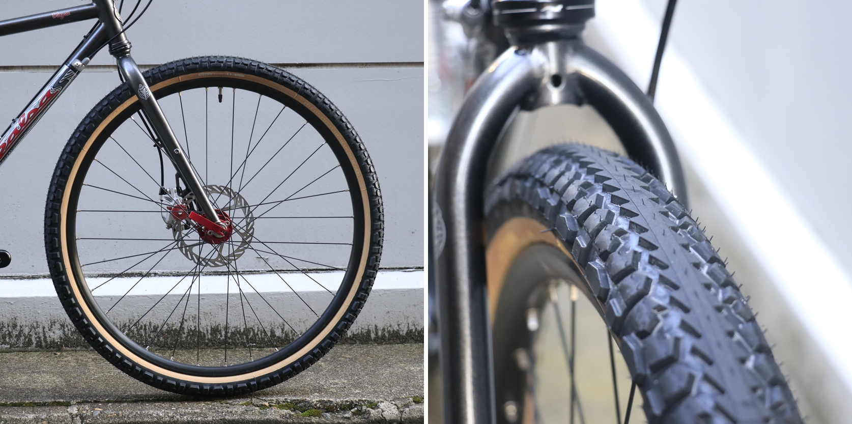 元々キャンピングなどの重装備にも適したツーリングタイヤ。マウンテンバイクよりは細く普通のクロスバイクやグラベルバイクよりは太い絶妙な太さは段差の乗りあげも安心&連なったセンタートレッドパターンで舗装路の転がりも充分軽い名作タイヤです。