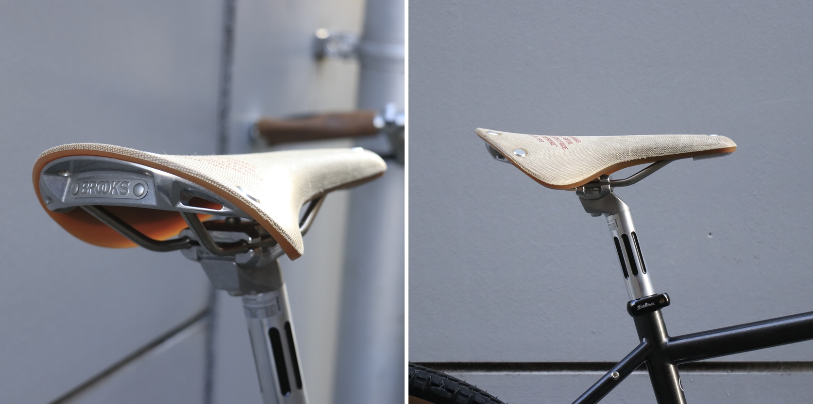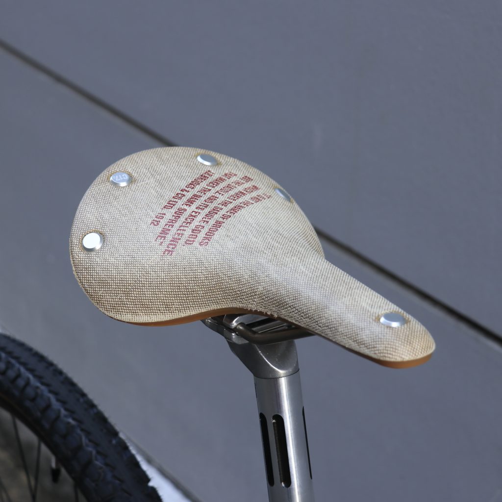 ハンモックのようなしなりがお尻に優しい本サドル。天然ゴムとコットンの風合いが本バイクとバツグンに良く似合います。
