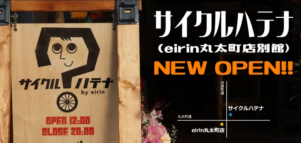 更に2018年3月からは既存店:eirin丸太町店のすぐ斜め向かいに“別館”として「サイクルハテナ」をNEWオープン!グラベルロードやツーリングバイク、それにまつわるアパレルやパーツ、バイクパッキングを始めとしたツーリング系アイテム、またキャンプグッズなど、今までの自転車屋の既成概念にとらわれることなくスタッフ自身が本音で良いと思えるアイテムをセレクト~販売もさせて頂いております。