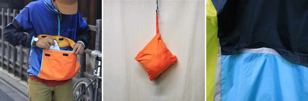 背面にはメッシュ性の通気孔を設け、着用時の快適さを追求しました。フロントのカンガルーポケット内部のドロップインポケットへの収納が可能なパッカブル仕様になっているため、荷物を最小限に抑えたい旅行にもおすすめです。
