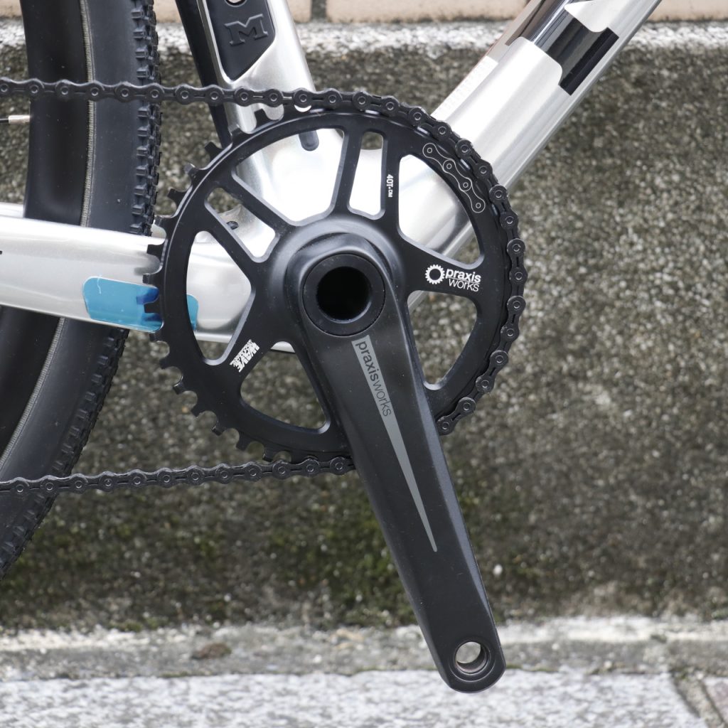 フロントシングルのクランク&チェーンリングにはPRAXIS WORKSを採用。