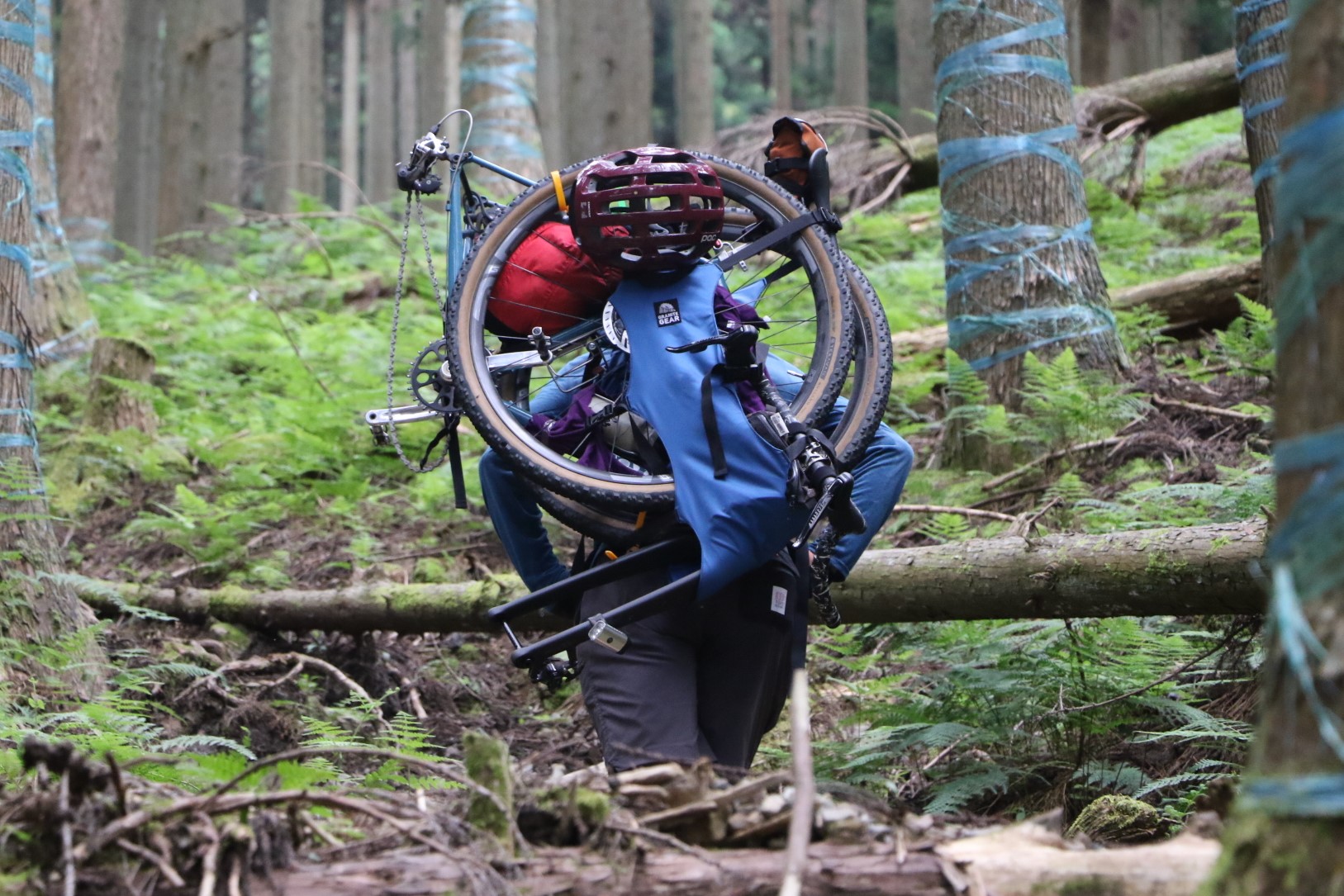 唯一コツとしては車体を縦向きパッキングする事はポイント。狭い山道を歩く際、木々に自転車が当たり難くなります。またディレーラーの位置は上向きが良いですね。