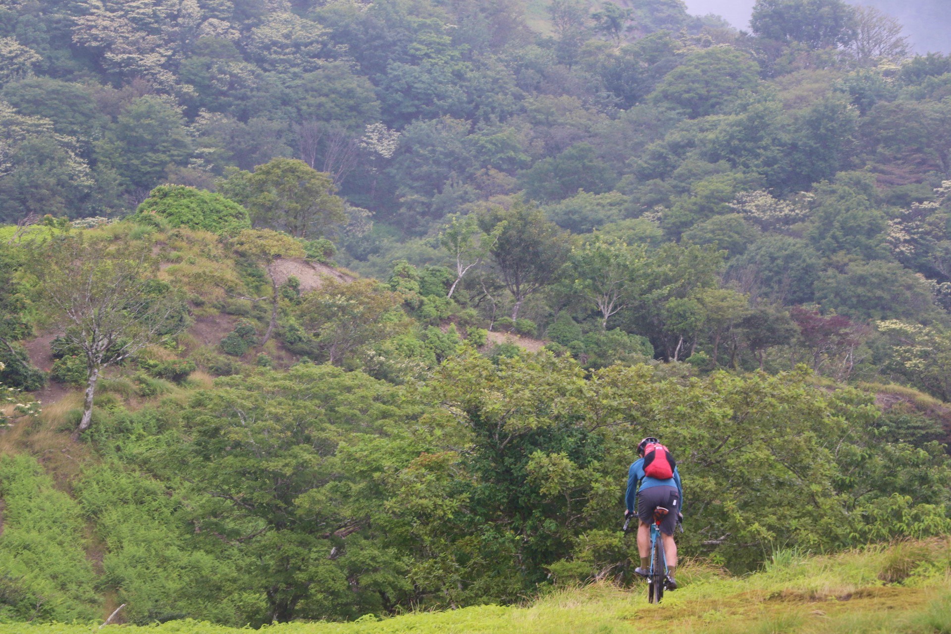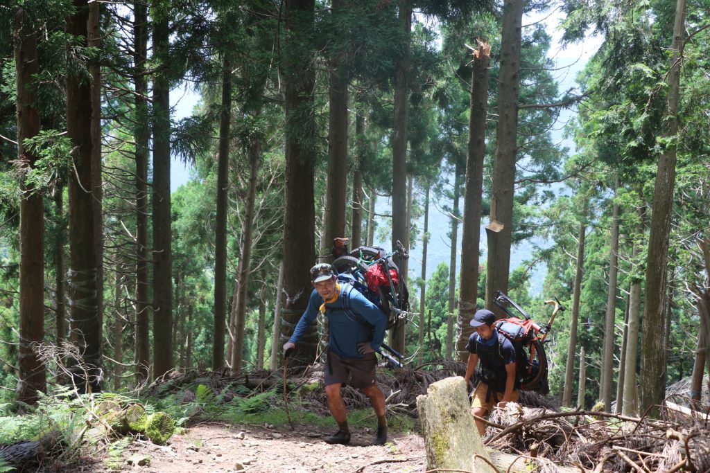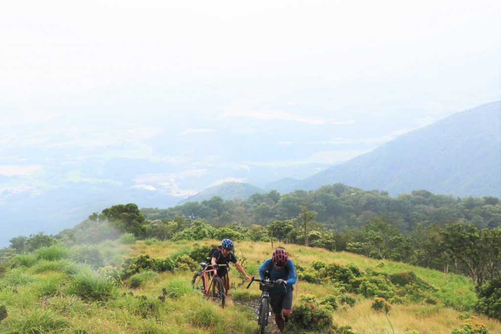 登山道入り口まではしばし気持ち良いサイクリングを経て。早速自転車を担いでハイクへGO!