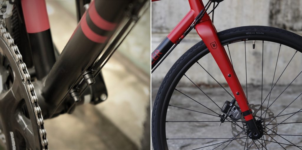 前後フェンダー・ラックマウントをはじめ、フレーム内2か所、ダウンチューブ裏、左右のフォークサイドに多くのボトルゲージマウント台座を配備。