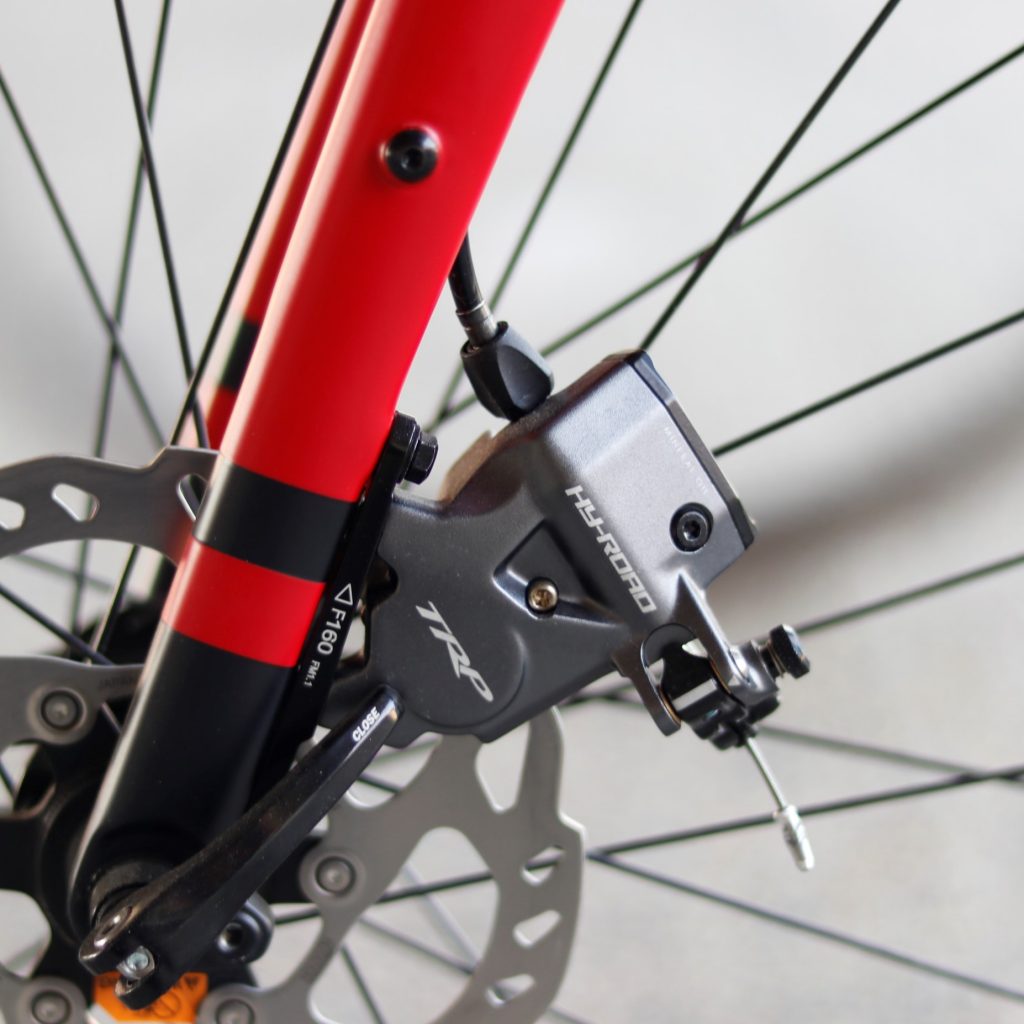ブレーキには、シクロクロスバイクやグラベルバイクのカスタムアップとして当店でもお馴染み、機械式STIレバーで動作可能や油圧ディスクブレーキキャリパー:TRP HY/RDが標準装備されております。