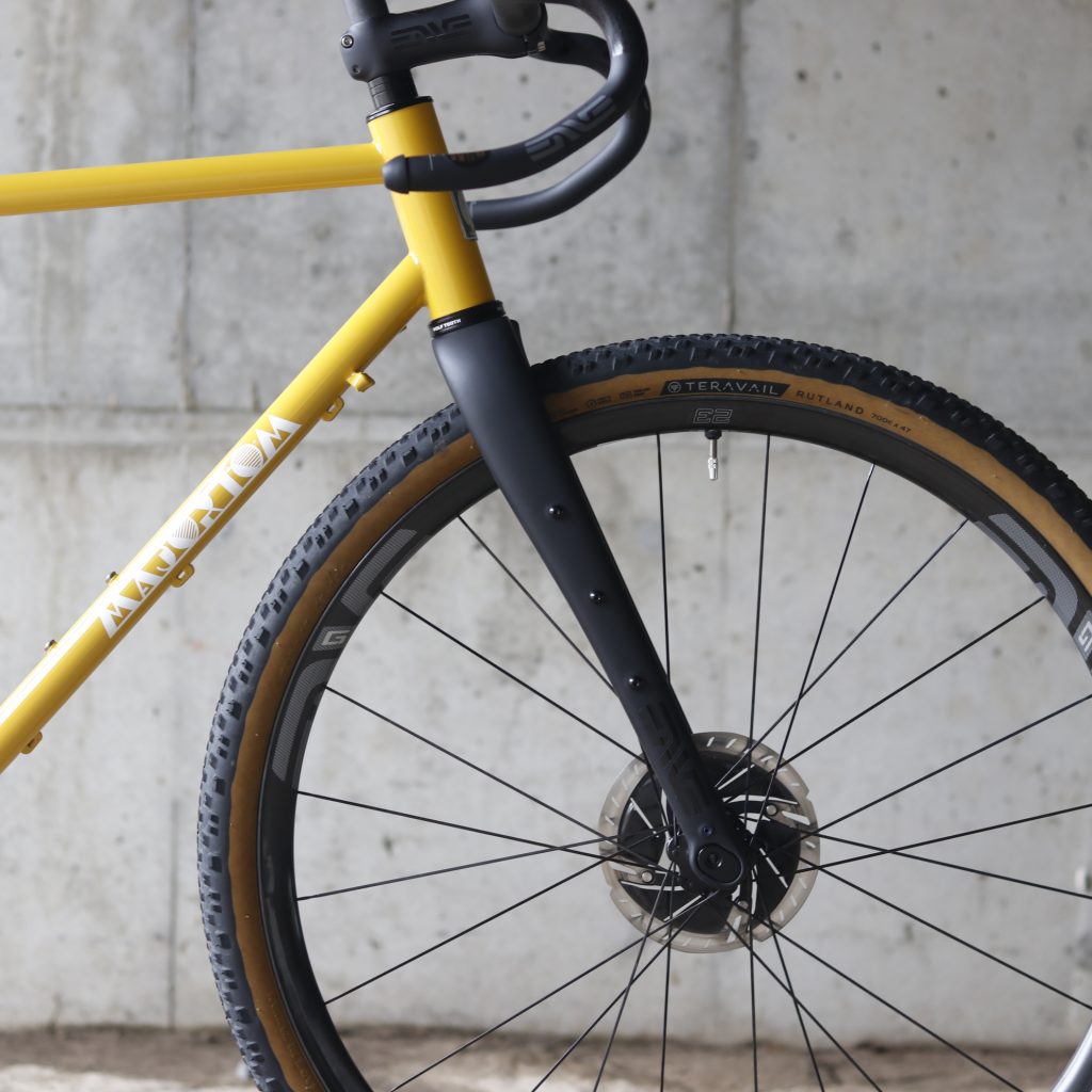 高い剛性と軽量性を誇るアメリカン名ブランドENVE製カーボンディスクフォークを標準セット。ツーリングに便利なサイドダボ&ダイナモライト用ケーブルホール配備。可変式エンドによりオフセット長49mm or 55.5mmの選択可能。