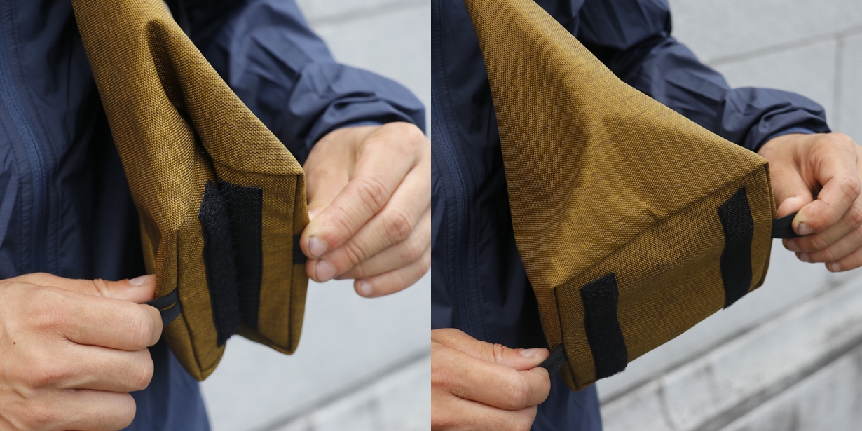天マチのダイニーマ素材は耐水性高い素材ですので、天マチのファスナーを閉めてストンと中へ落とせば、バッグ内で部屋が上下で分割され、結露で中の荷物が濡れる心配もございません。