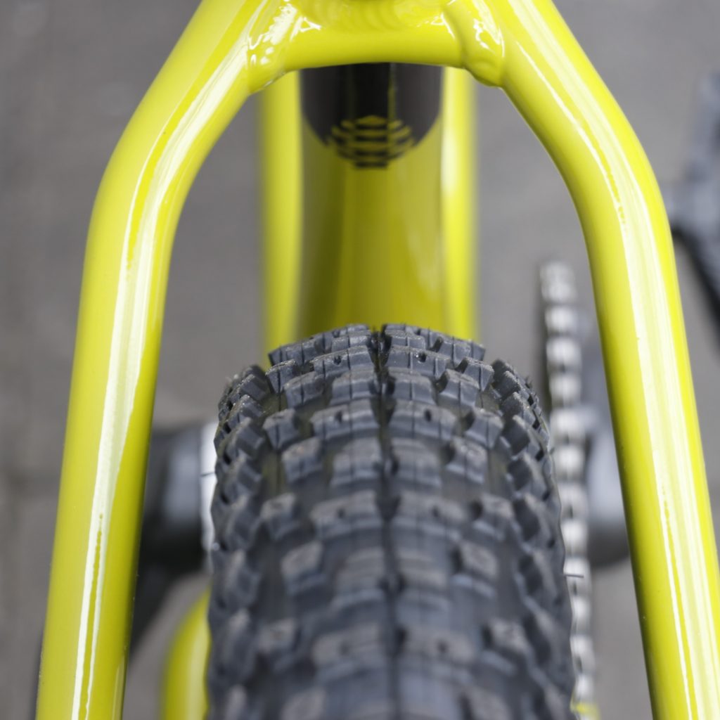 標準では27.5×2.8″のセミファットが採用。最大タイヤクリアランスは29x2.6”。