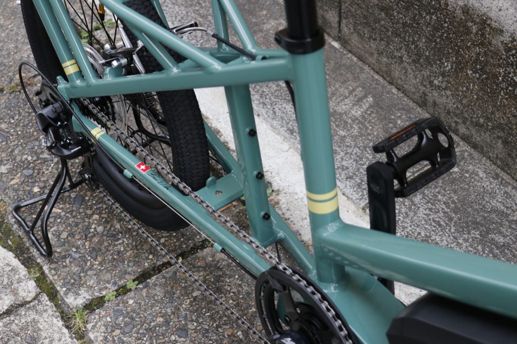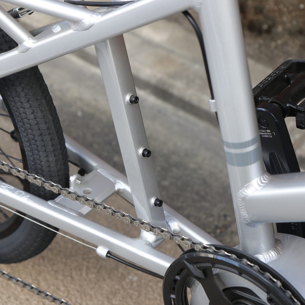 一般電動車ならバッテリーがマウントされることの多いシートチューブ裏はカーゴケージ等が取り付けられる3つ穴ダボとなっています。