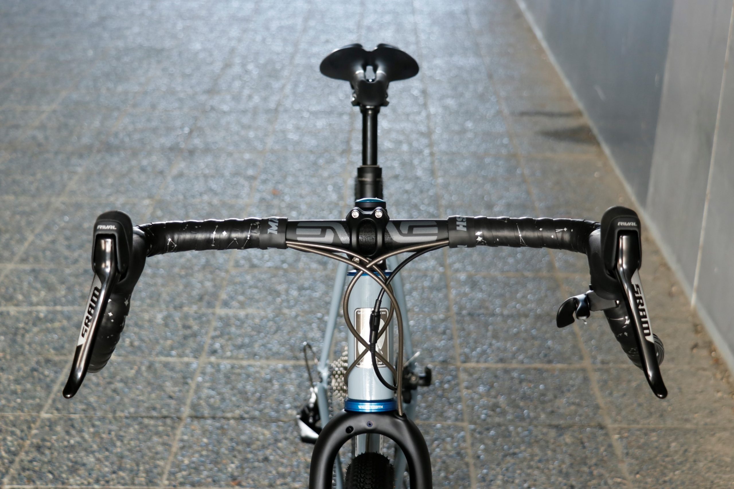 MAJORTOMに標準採用されるENVE ADVENTURE FORKに合わせ、ステム&ハンドルともに最高レベルのENVE製をチョイス。オフロードでの安定感や操作性を高めてくれるブラケット部に比べドロップ部が12cm程広いフレア型バーENVE BAR GRAVEL 31.8は、程よい広がり具合でMAJORTOMのスマートなフォルムにも◎